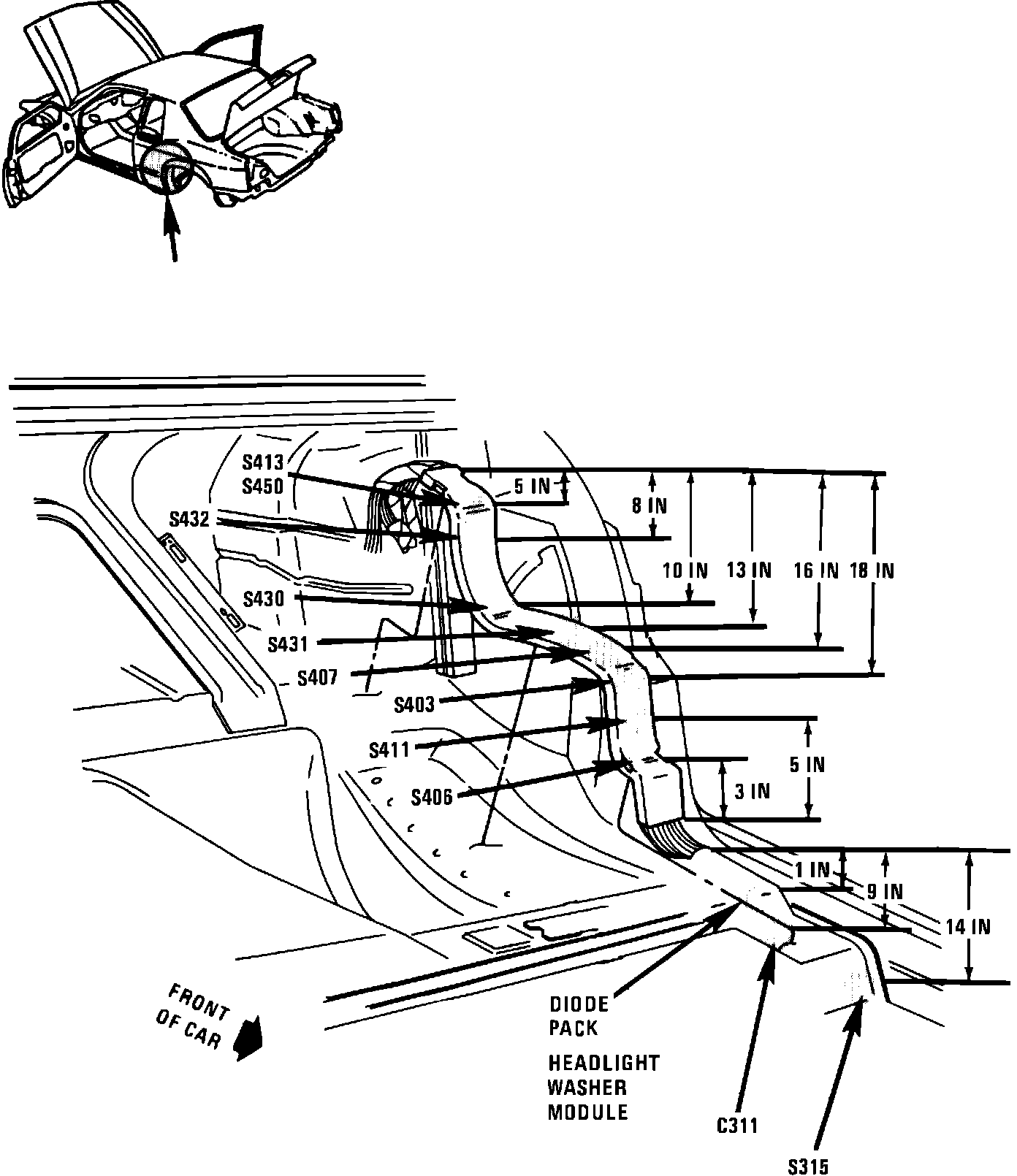 Body main harness, under LH rear seat, 8 inches forward of rear edge of LH seat pan channel