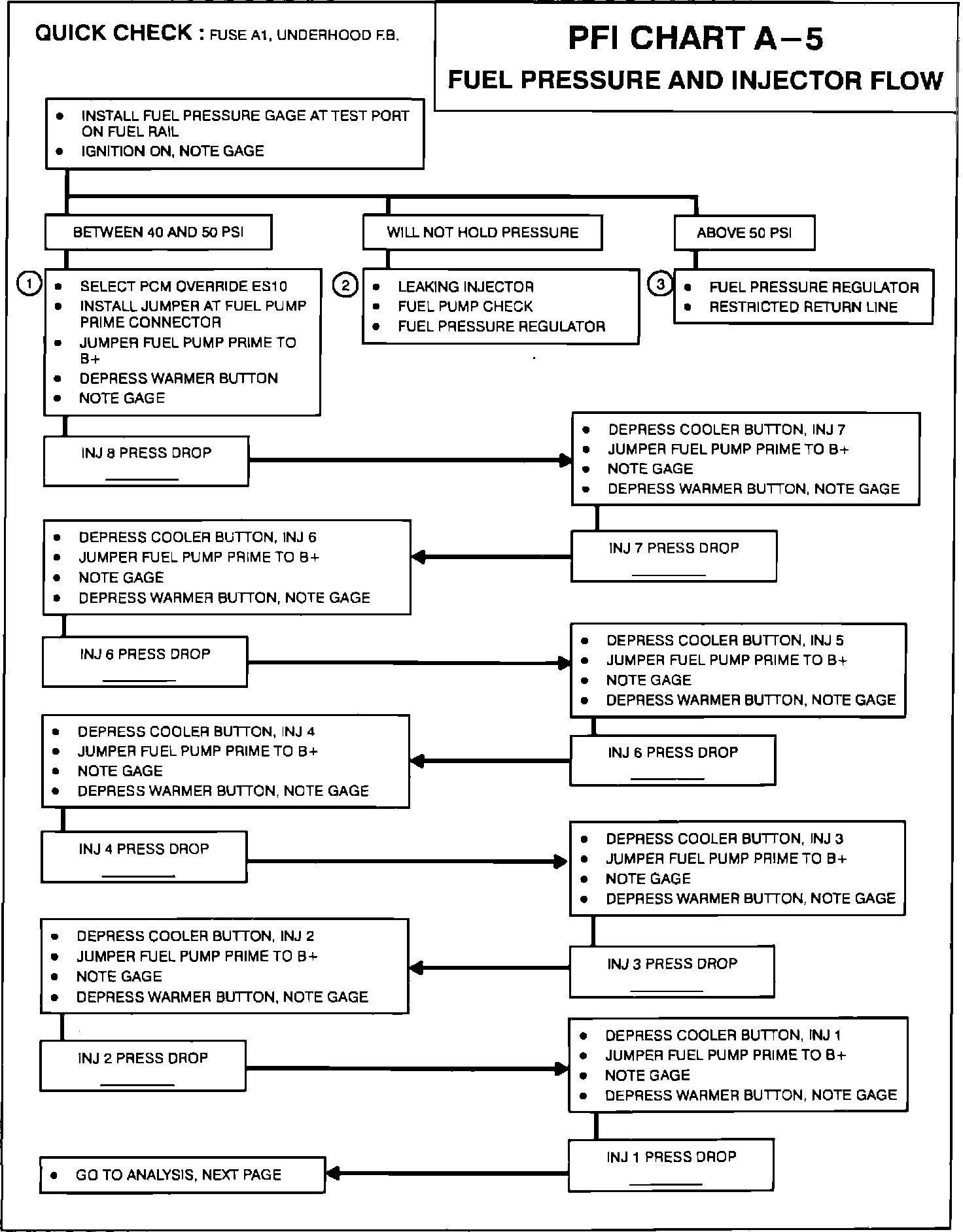 This procedure tests for fuel pump's ability to deliver fuel to the injector fuel rail, the fuel injectors to deliver a metered quantity of fuel, and the vacuum signal to the regulator to control fuel pressure.