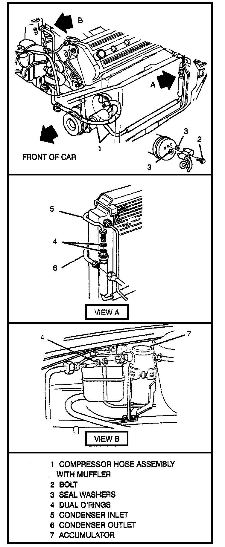 4. One bolt securing compressor inlet and outlet line fitting.