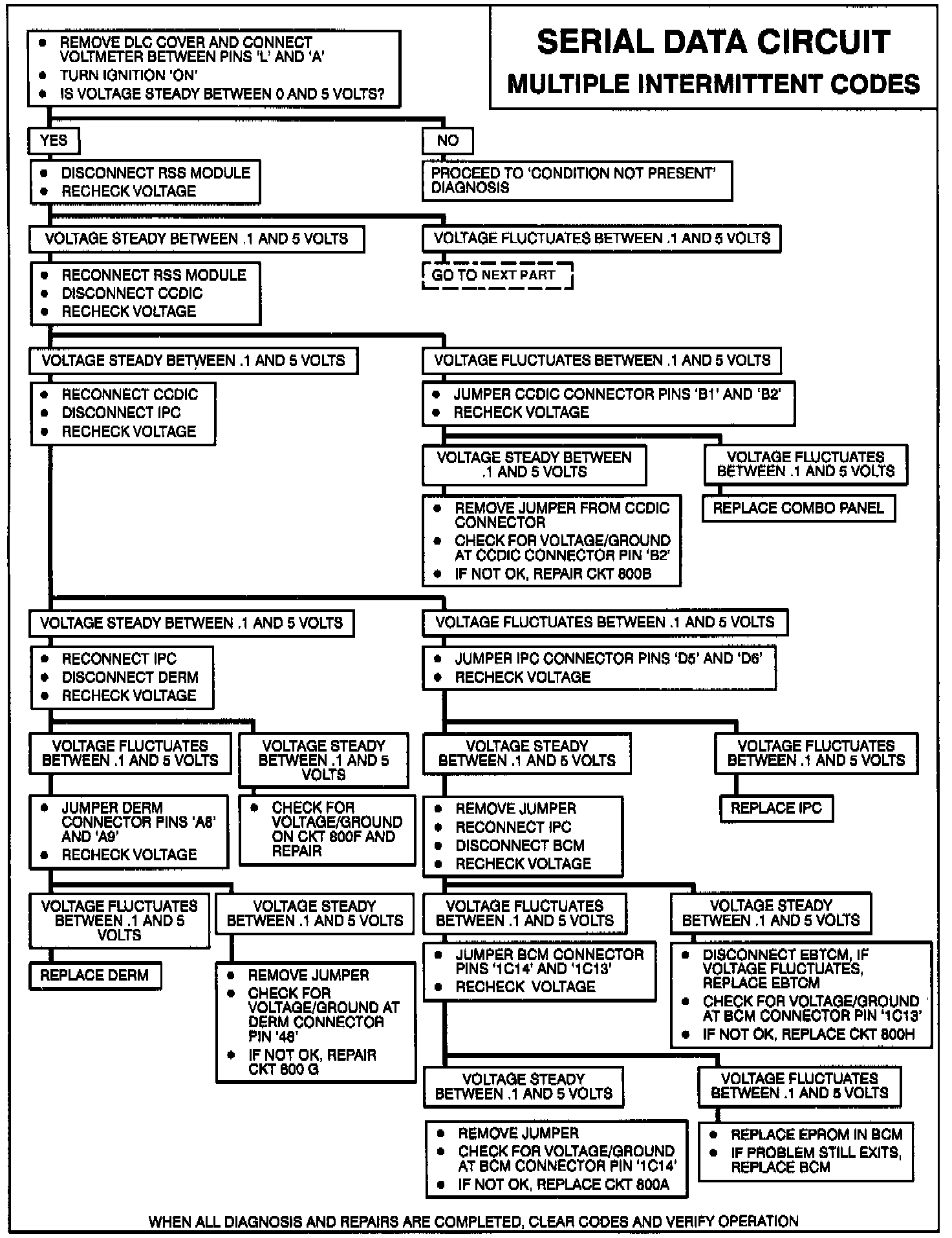 A damaged data line circuit or one of the components connected to the data line may cause multiple or intermittent setting of the data line Codes B332, B333, B334, B335, B336, B337 and/or B339. When operating normally, the serial data line voltage should continually fluctuate from .1 to 5 volts.