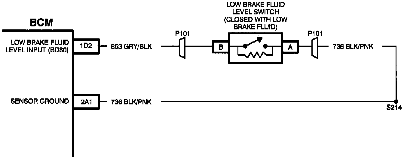 The BCM supplies 5 volts to the low brake fluid circuit and the brake fluid level switch provides the single path to ground. The BCM supplies and internally monitors the voltage level of the circuit at pin "1D2." When the brake fluid switch is open, the BCM will detect 2.5 volts due to the switches internal resistor. If the brake fluid switch provides a path to ground (low brake fluid condition present), the BCM will detect low voltage (less than 1.5 volts). If the condition exists for at least 3 seconds, the BCM will send the "LOW BRAKE FLUID" message to the CCDIC.