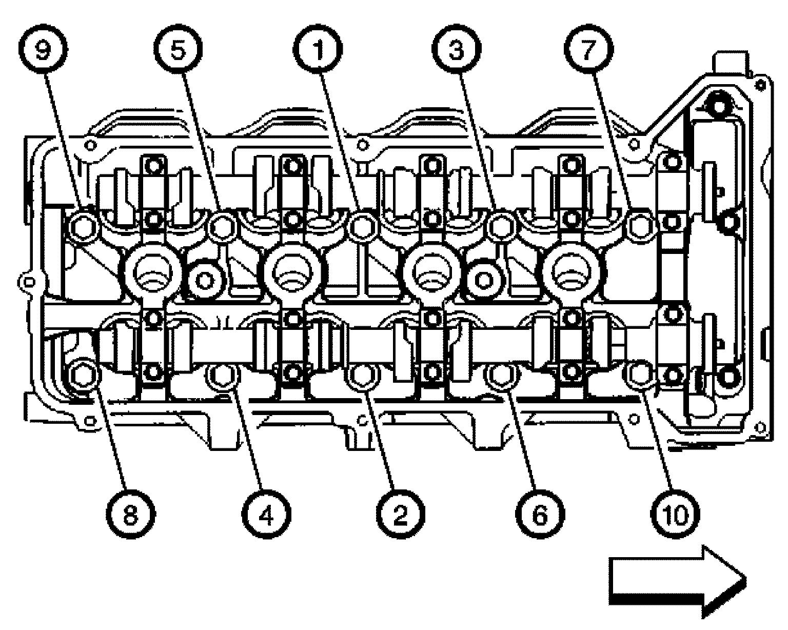 6.1. First Pass - Tighten the right cylinder head M11 cylinder head bolts to 40 Nm (30 lb ft ) in the sequence shown.