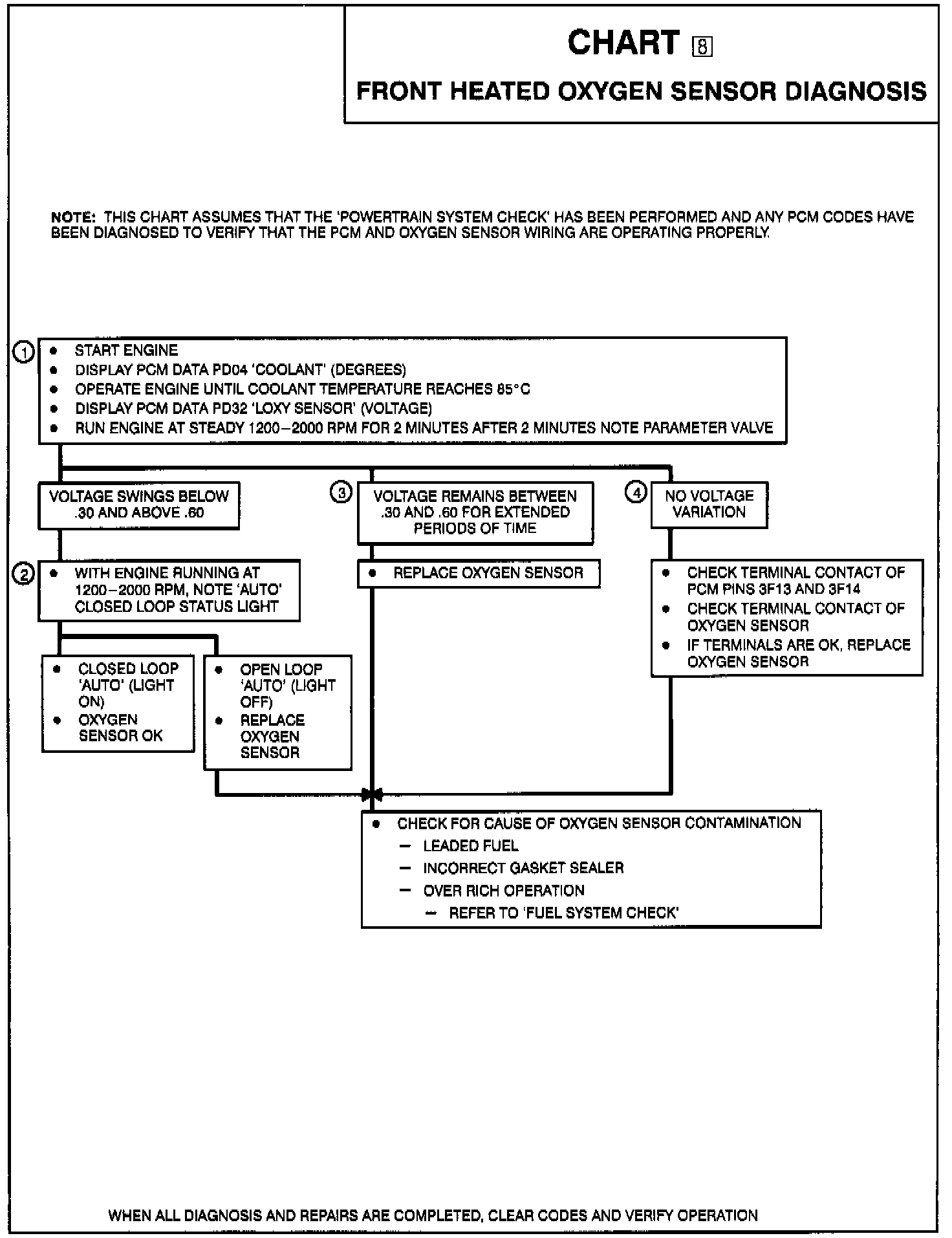 Powertrain Chart 8 is designed to be used after the oxygen sensor circuit and PCM operation have been verified through the Powertrain System Check and PCM code diagnosis. Chart 8 should identify oxygen sensors that are: