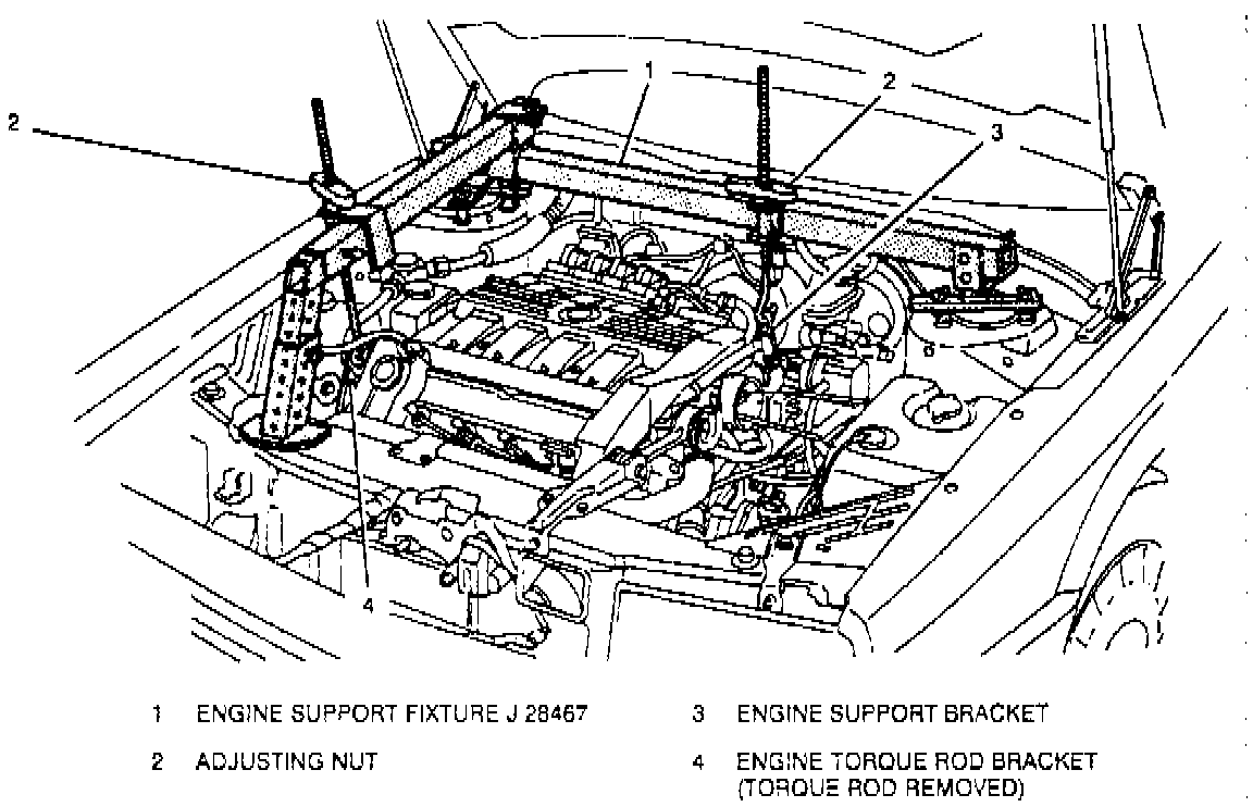 7. Install engine support fixture J-28467 or equivalent, then raise powertrain until weight is off mounts.