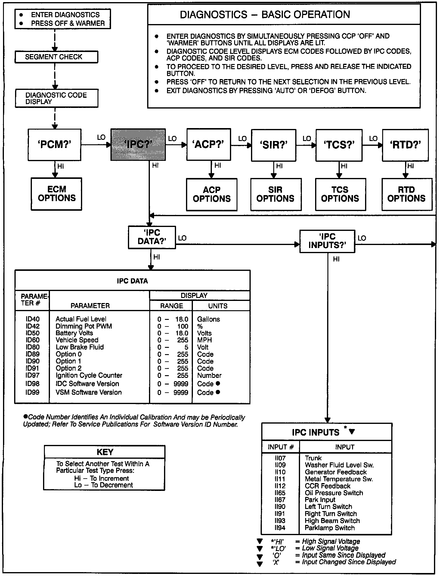 II12 The RIDE CONTROL FAULT display reads the state of the CCR input. Normal operation is 'LO' below 5 MPH and 'HI' above 15 MPH.