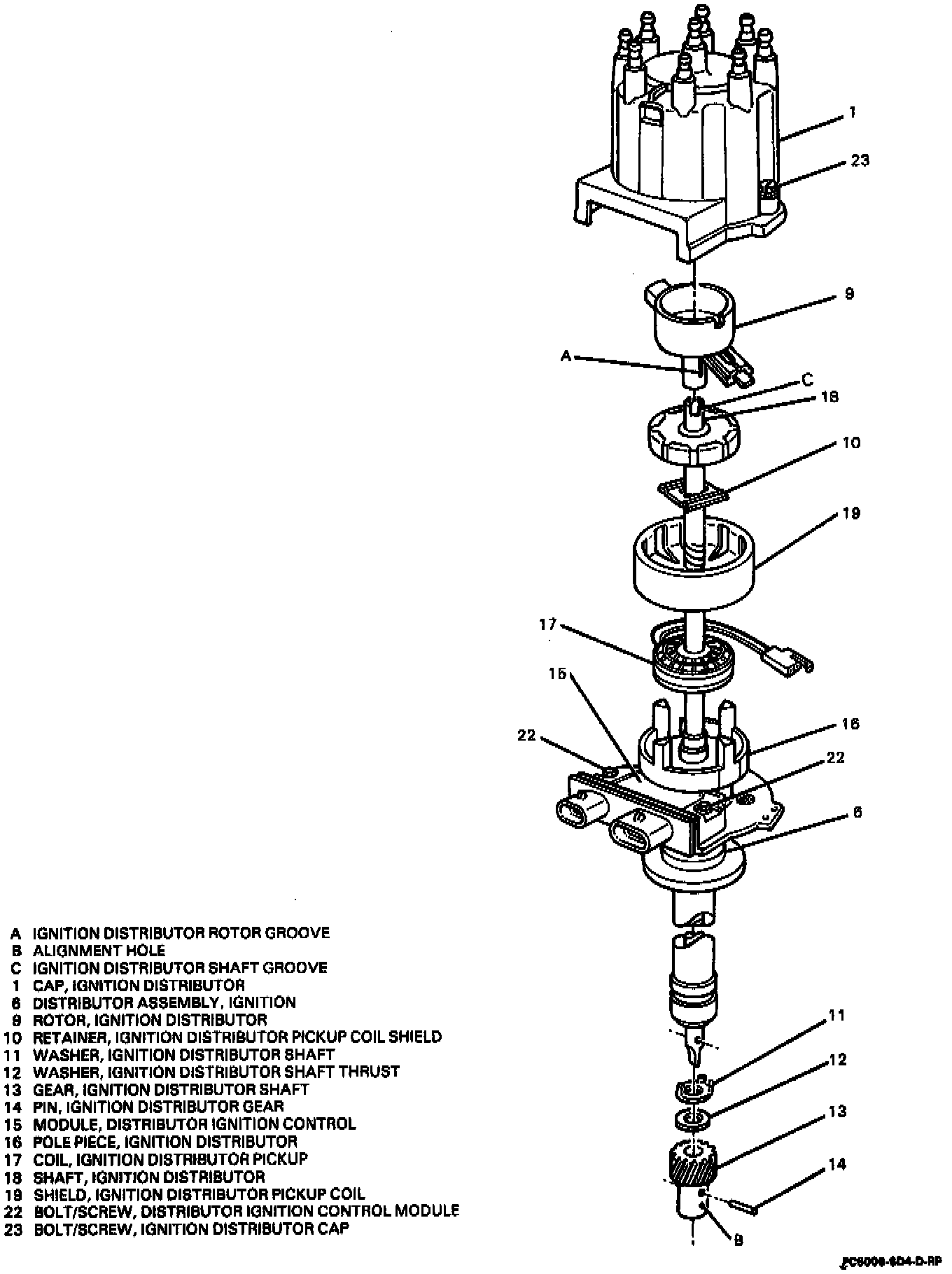 1. Distributor cap (1) (Refer to accompanying image for numbered references) by loosening ignition distributor cap bolts/screws (23).
