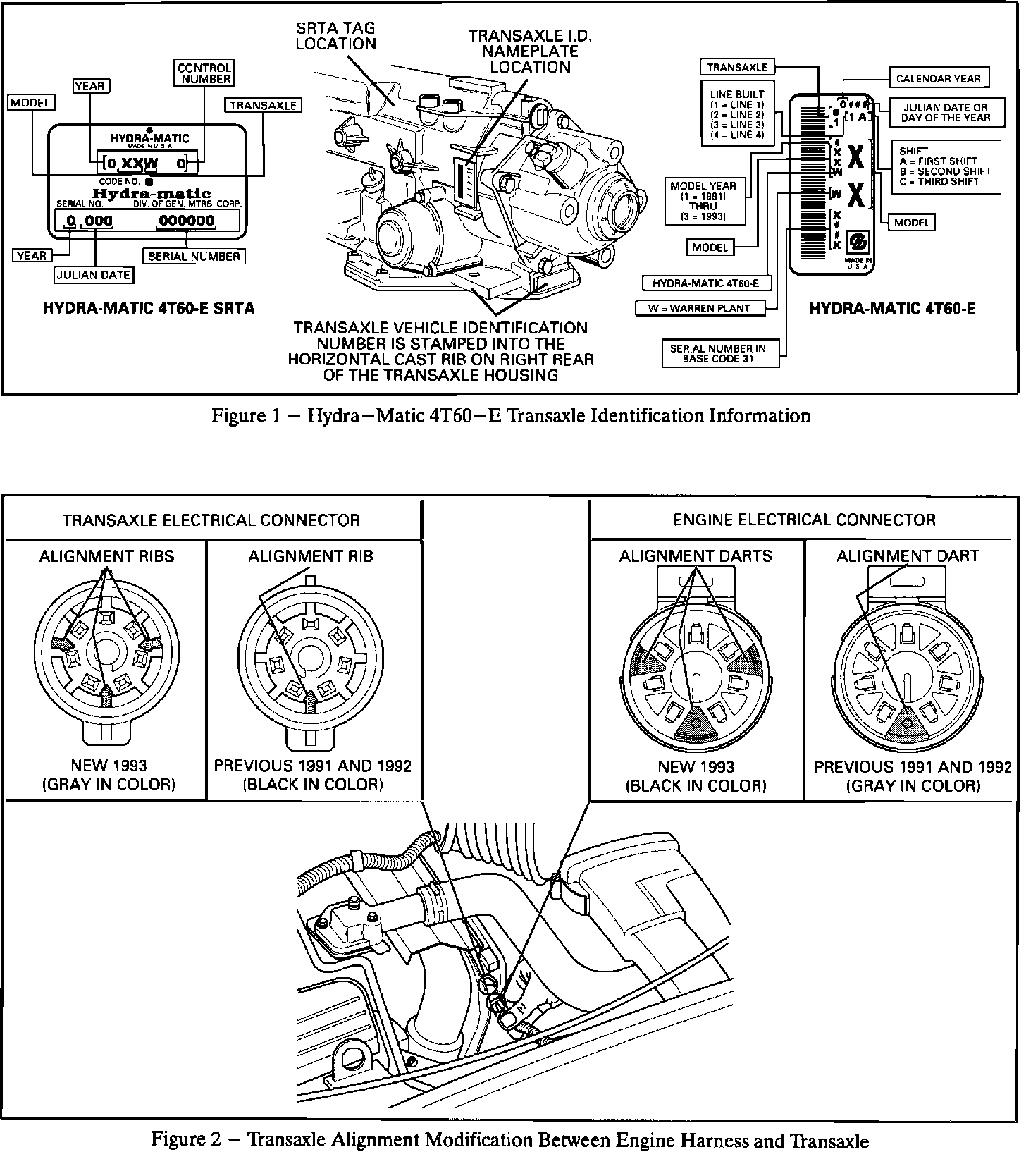 1993 Hydra-Matic 4T60-E (RPO M13) transaxles all use a redesigned transaxle electrical connector. Refer to Figure 1 to read the transmission date code. The redesign involves the addition of two alignment ribs to the electrical connector. The change also requires that the engine connector be modified to accommodate the added alignment ribs. Refer to Figure 2.