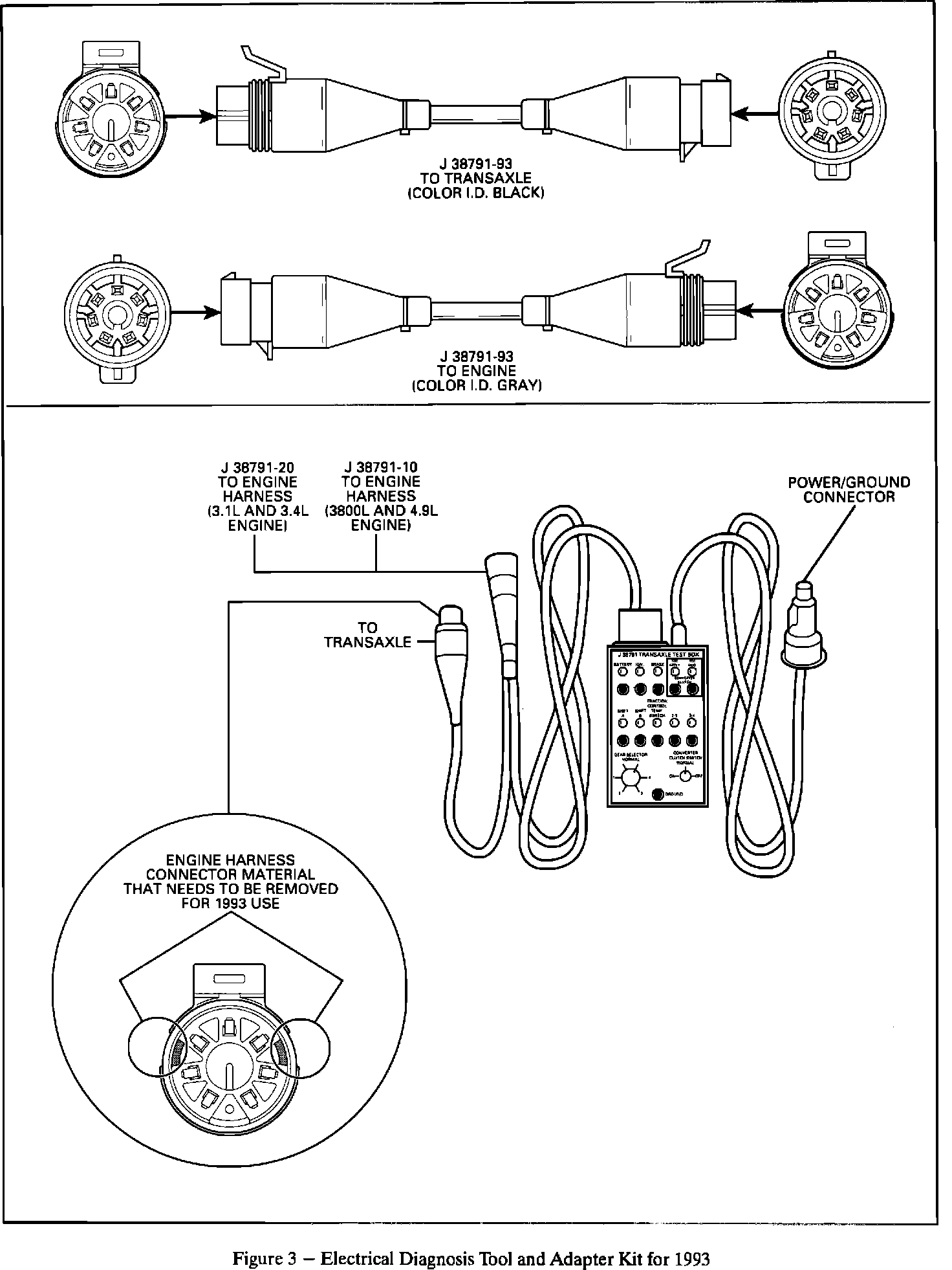 An alternative to modifying the existing adapters would be to purchase new Kent-Moore adapters (J-38791-93) which are used in conjunction with adapters J-38791-10 and/or J-38791-20. These new adapters simulate the modified engine harness connector. The Kent-Moore adapters produce the same results as with the procedure above but without altering the existing adapters.