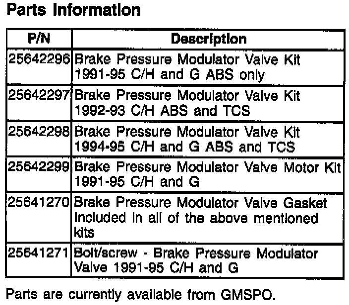 As of February 9, 1995, parts will be available through GMSPO that will allow serviceability of the Pressure Modulator Valve (PMV) Assembly. Currently the unit is replaced as a whole assembly. This bulletin is to inform that the PMV will be split into 2 units: 1) the Valve Body, and 2) the Pump and Motor Assembly, which can then be individually replaced.