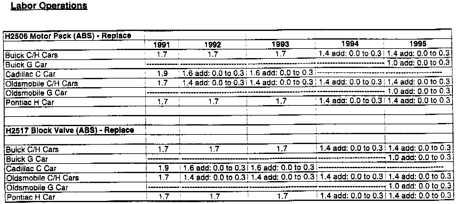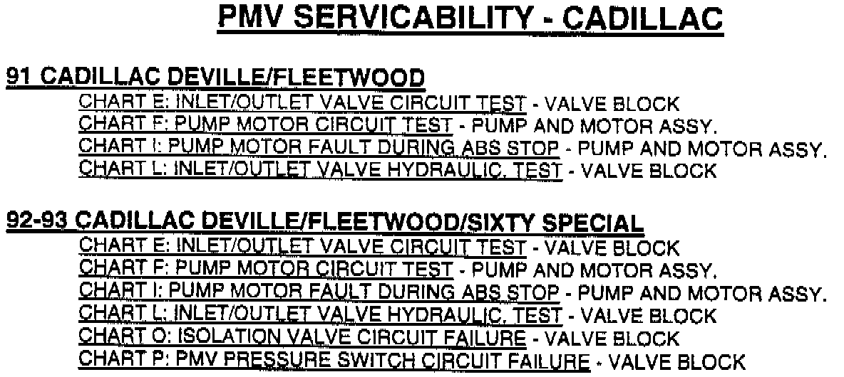 The following attachments (PMV Serviceability - Buick, Cadillac, Oldsmobile, and Pontiac) list by division and year all of the tests, charts or DTC's which currently state to replace the PMV Assembly. After the title of each test, chart, or DTC is the name of the faulted unit which is to be replaced as a result of this bulletin. For example, in Test B: PMV Continuity Test of the 1991 Buick C/H, all areas where it states to replace the PMV Assembly should now state "replace the valve block only".