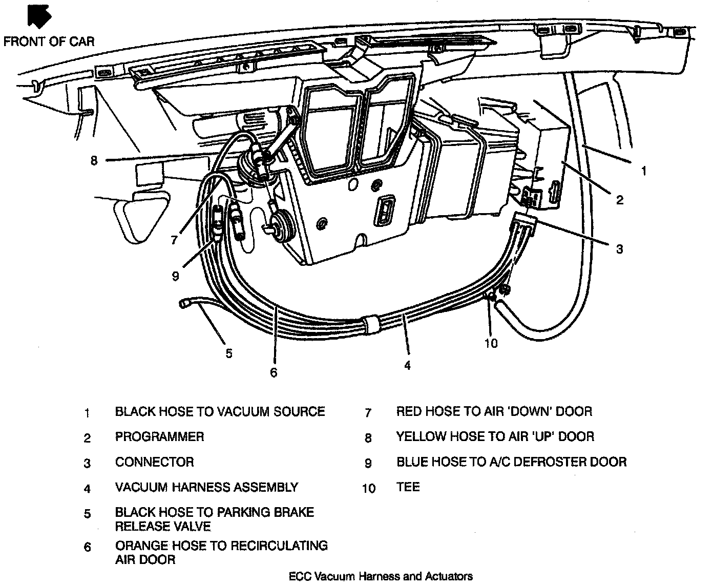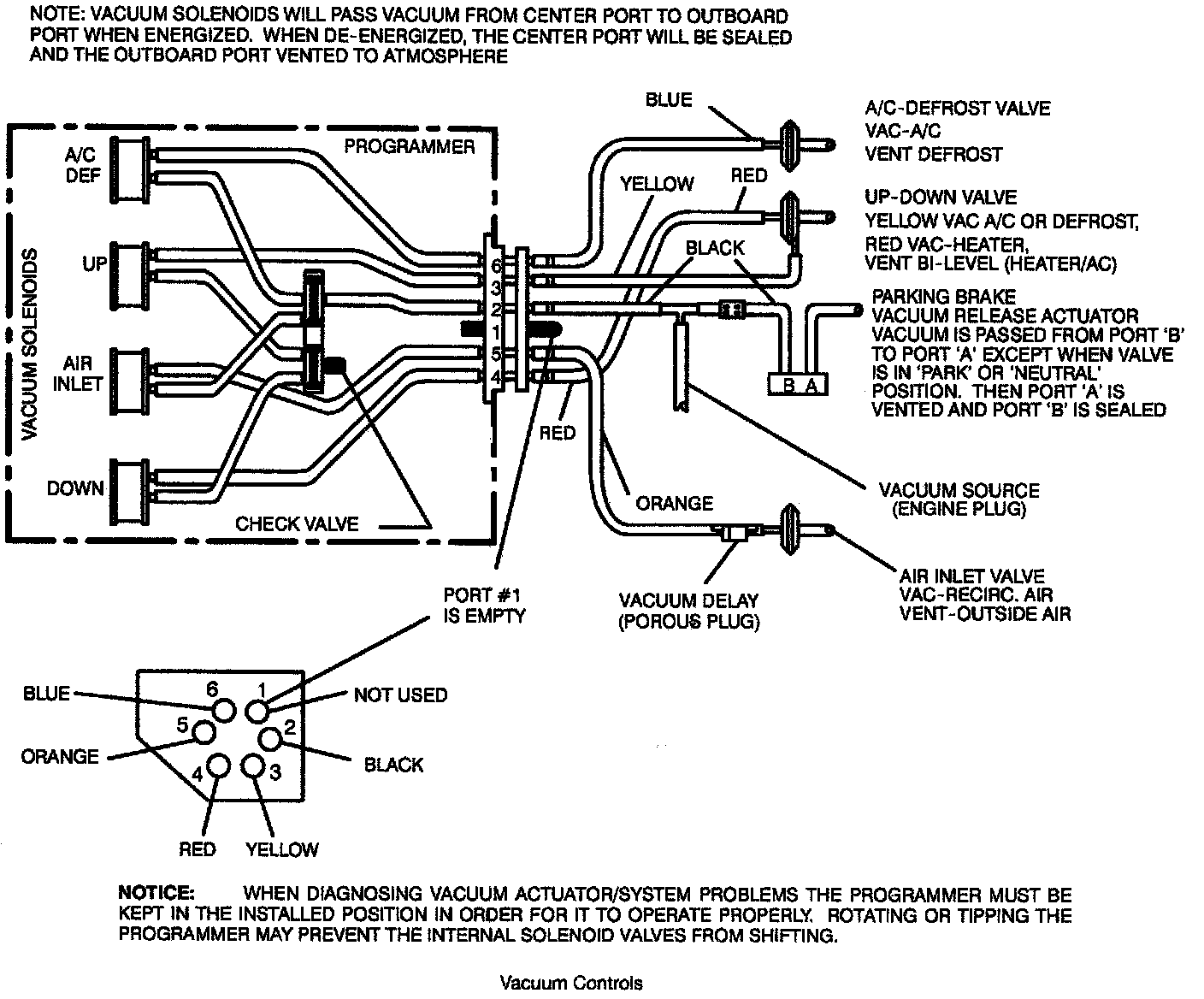 The three position up/down valve is operated by a vacuum actuator. In its relaxed location, the valve is in the middle position allowing air to flow upward through the A/C outlets or windshield defroster, and downward through the heater outlet. With vacuum applied (through the yellow vacuum hose to the up/down valve actuator) the valve is pulled downward. This allows air to flow upward through the air distributor to either the A/C outlets or the defroster outlets, but cuts off the flow to the heater outlets. With vacuum applied (through the red vacuum hose to the up/down valve actuator) the valve is pulled upward allowing air to flow downward toward the heater outlets. In all three positions a small amount of air is directed to the side window defroster outlets and rear seat outlets.