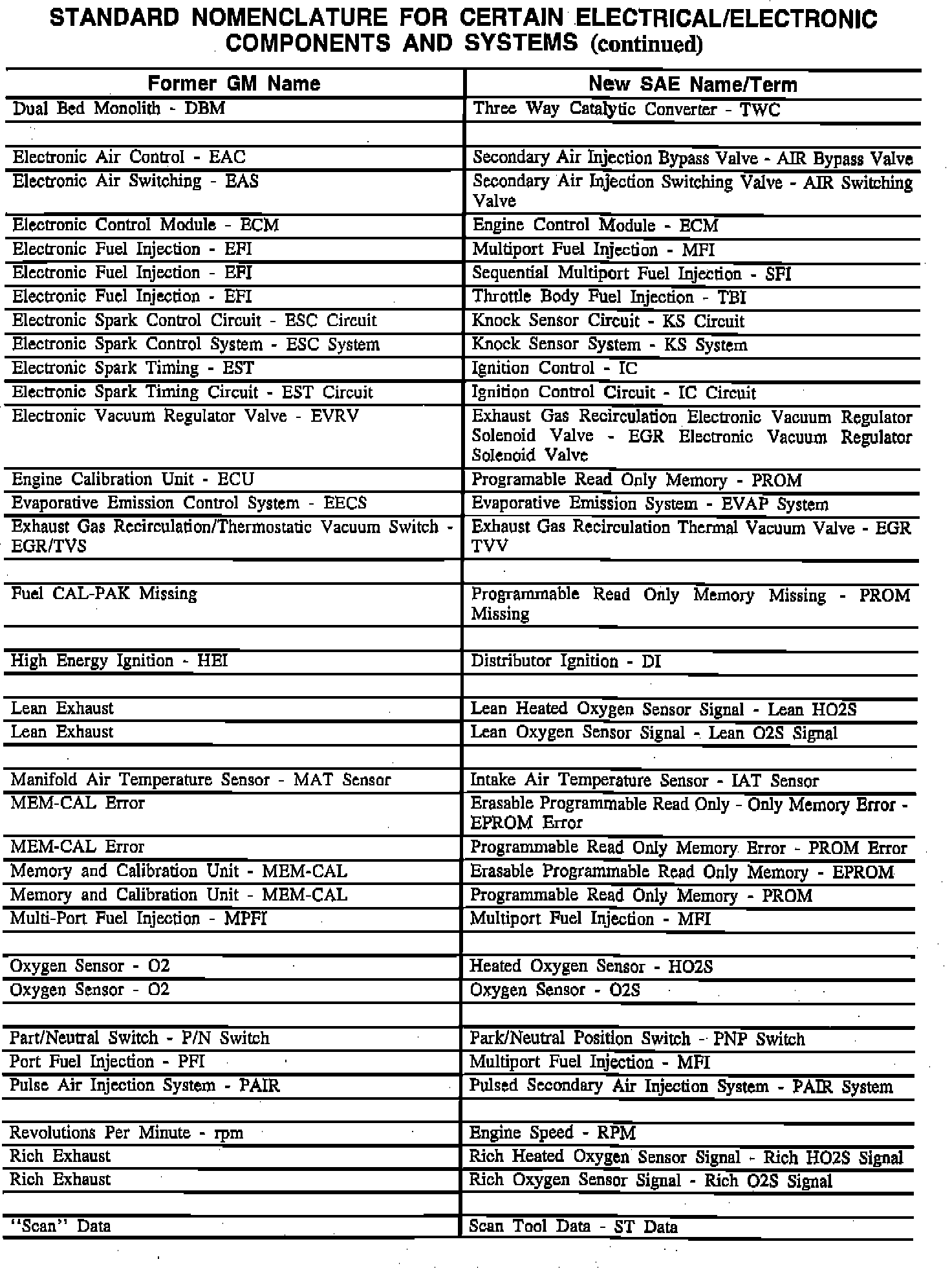 Since the 1993 model year, General Motors is now complying with the Society of Automotive Engineers (SAE) Recommended Practice J-1930. J-1930 is an industry wide standard that was adopted into government regulation and requires certain electrical and electronic components and systems to be known by the same nomenclature that have the same function. This standard is also being applied to abbreviations and acronyms.
