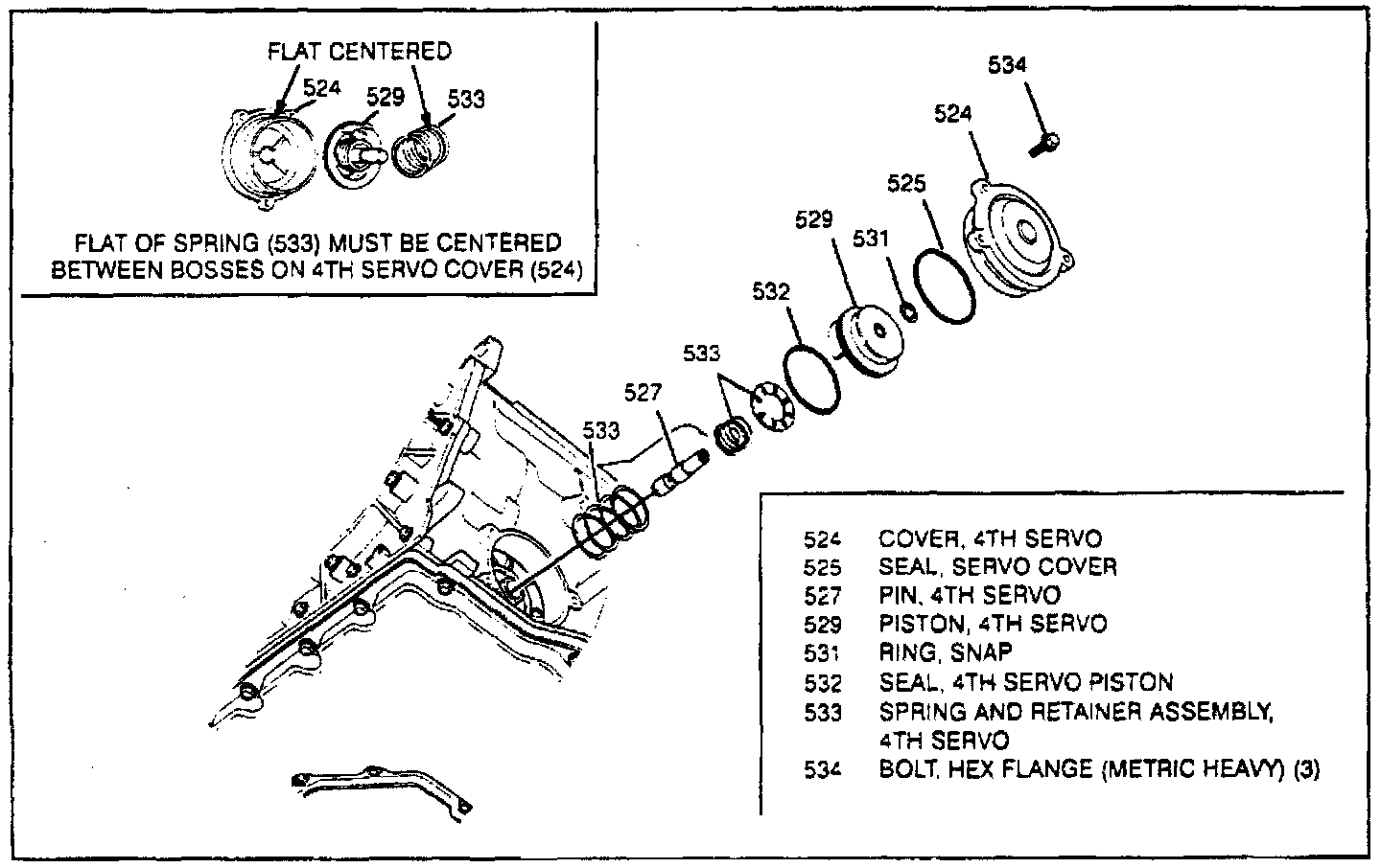 2. Install 4th servo and large spring into cover. Ensure tab on piston is aligned with notch in case bore (early models).