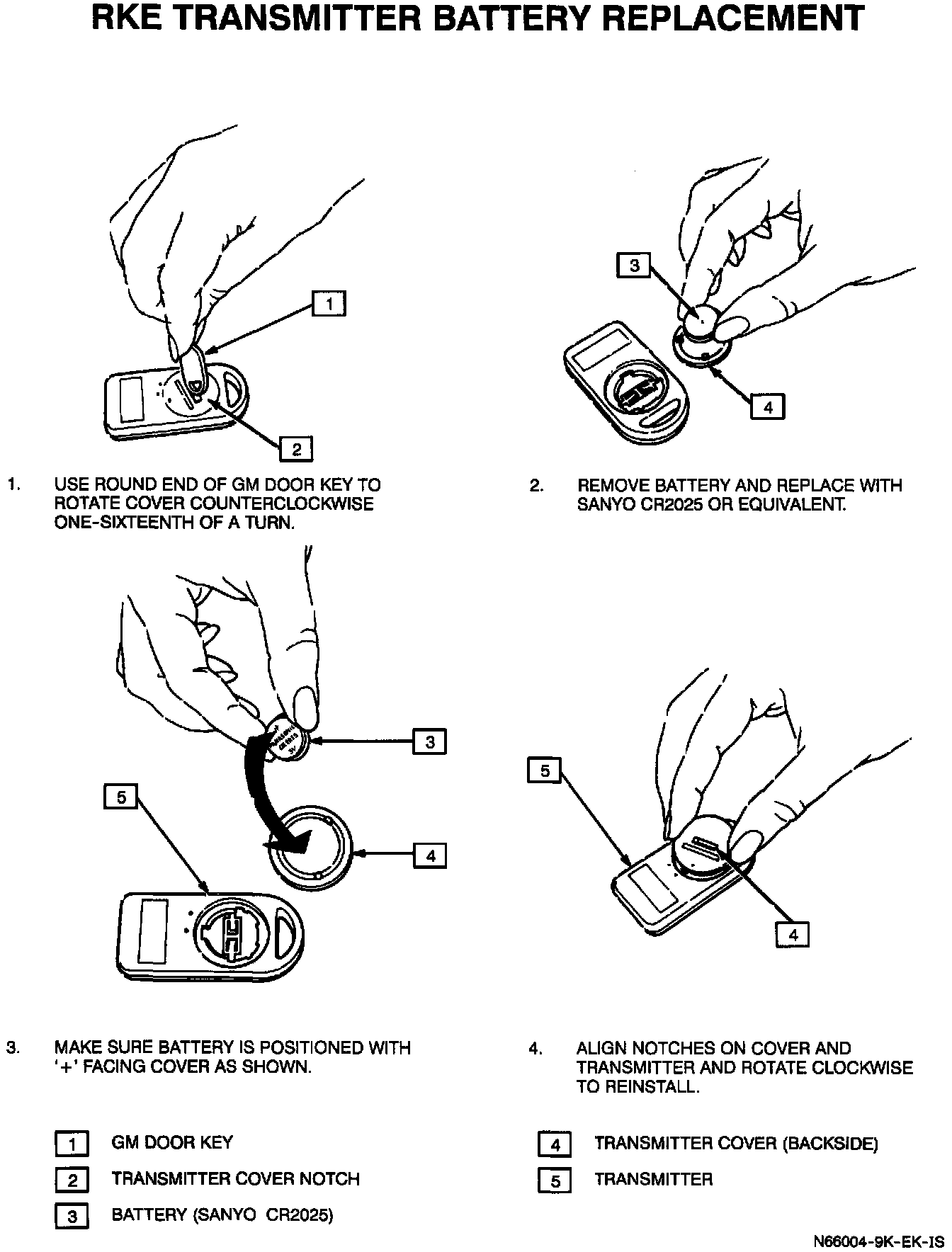 The remote transmitters for the RKE system require periodic battery replacement. Battery life under normal operation should be approximately two years. The back side of the transmitter contains a cover providing access to the battery compartment. To open, place the round end of a GM Door Key in the slot and rotate the cover counter-clockwise one sixteenth of a turn. The cover should then be able to be lifted from the transmitter. An O-Ring is used to ensure a proper seal and should be reinstalled when replacing the battery. Use replacement battery Sanyo CR2025 or equivalent.