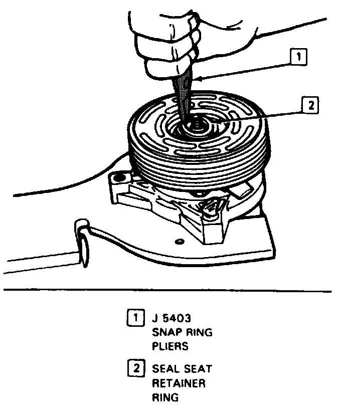 4. Install the new seal retainer ring with its flat side against the Seal, using Snap-Ring Pliers J 5403. Use the sleeve from O-ring installer J 33011 to press in on the seal retainer ring so that it snaps into its groove.
