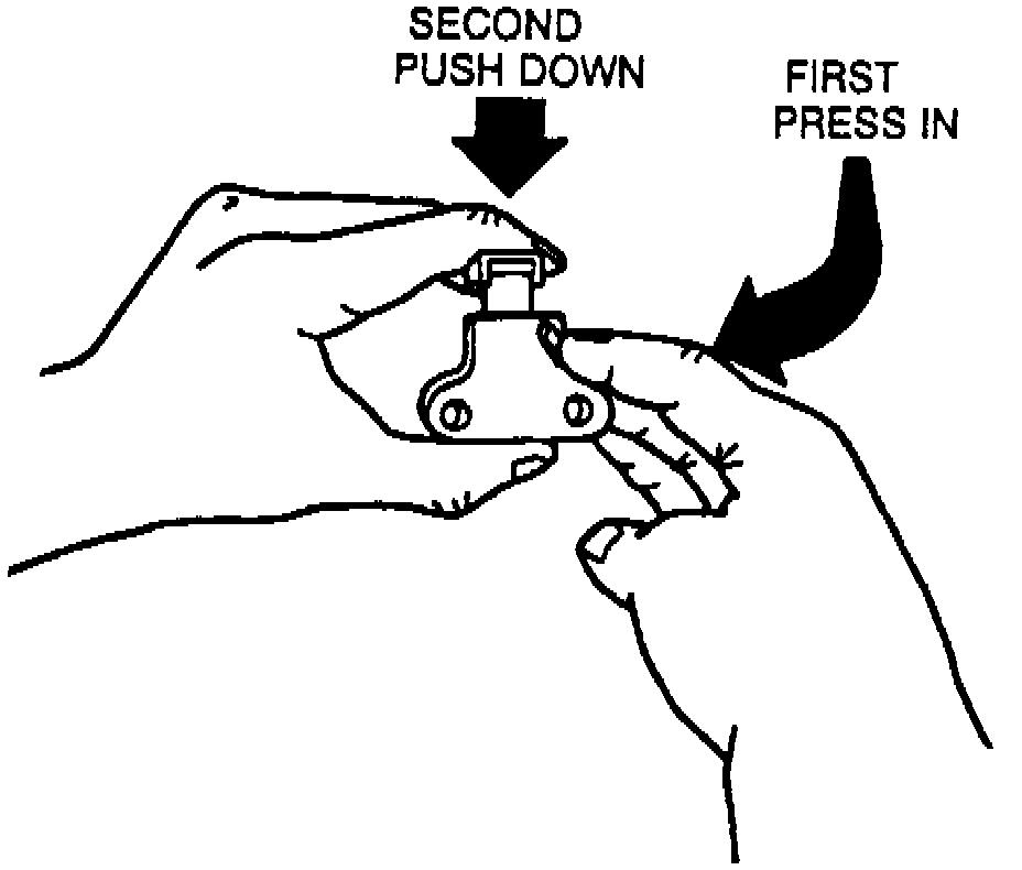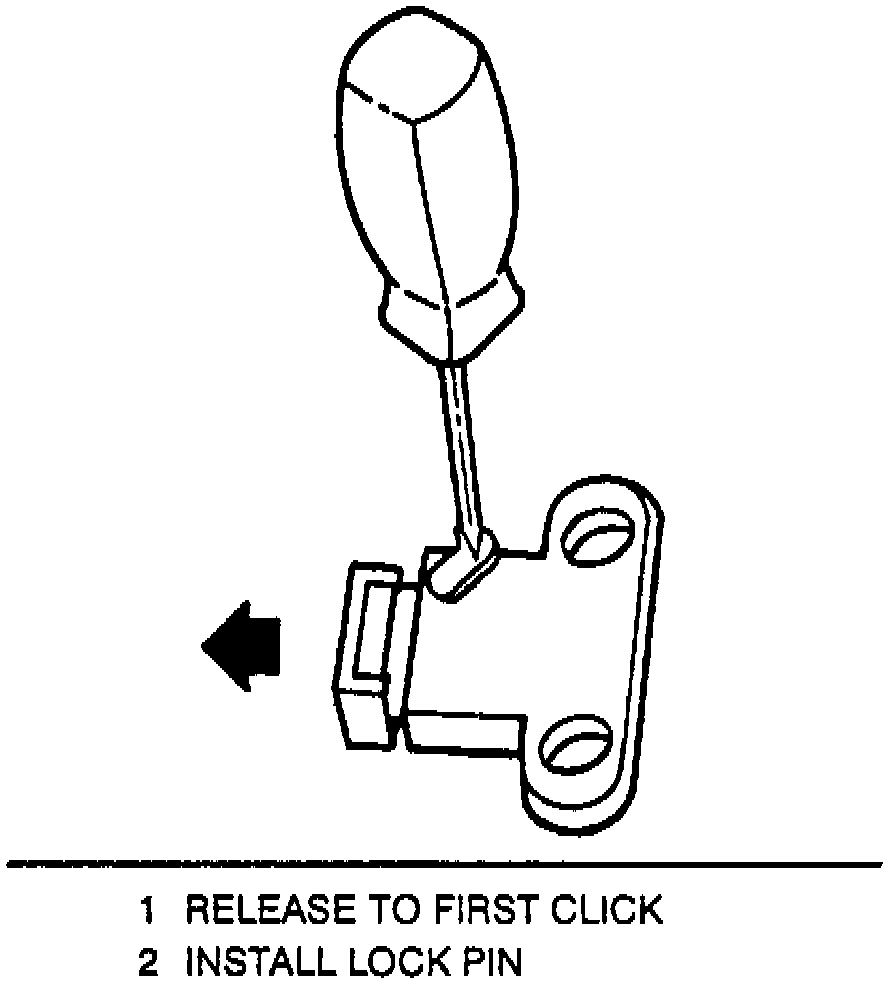 ^ As ratchet lever moves to first click, hold tensioner shoe inward and insert a pin through hole in release lever.