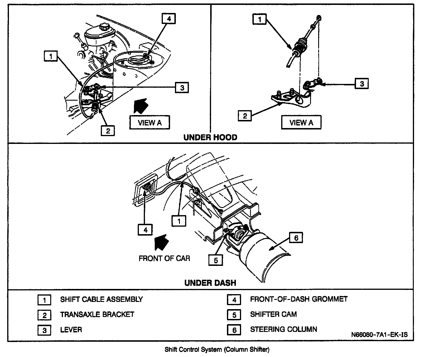 2. From inside of car, pull cable into position, install cable on column bracket and install cable end on shift cam.