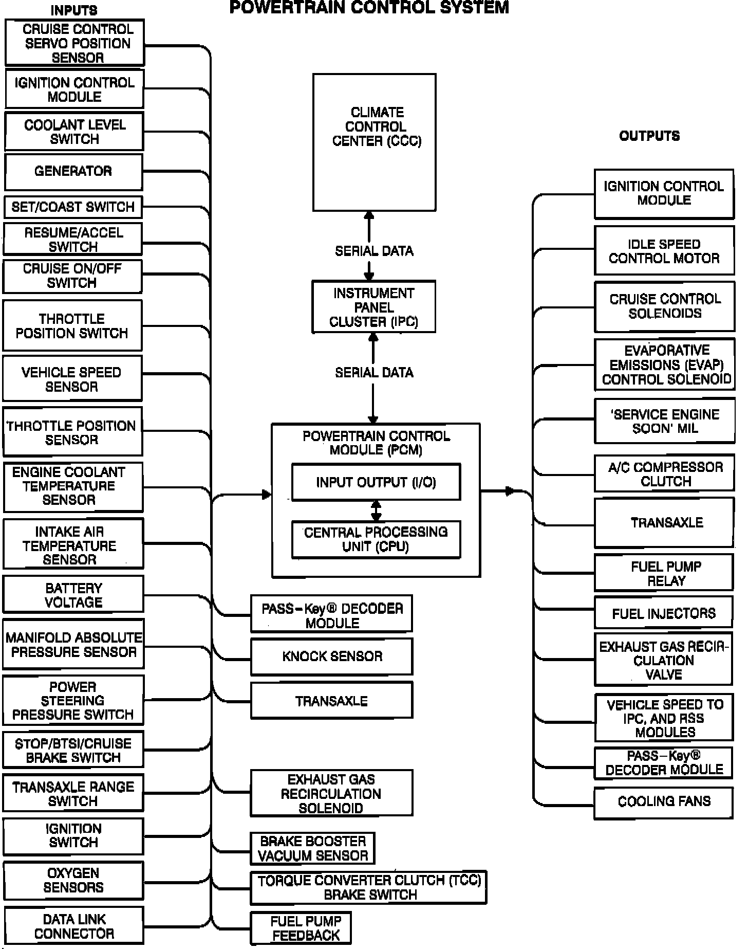 This vehicle uses several electronic components which form an electronic computer network, designed to control various engine and body sub-systems. The heart of the computer network is the PCM. The PCM communicates with the Instrument Panel Cluster (IPC) and the Electronic Climate Control Center (CCC) in order to actuate the various on-board diagnostic features of the computer system. The PCM has an internal microprocessor which is the center for communication with all the other components, and controls the on-board diagnostics of the vehicle. All system sensors and switches are monitored by the PCM or one of the other major components that complete the computer system network.
