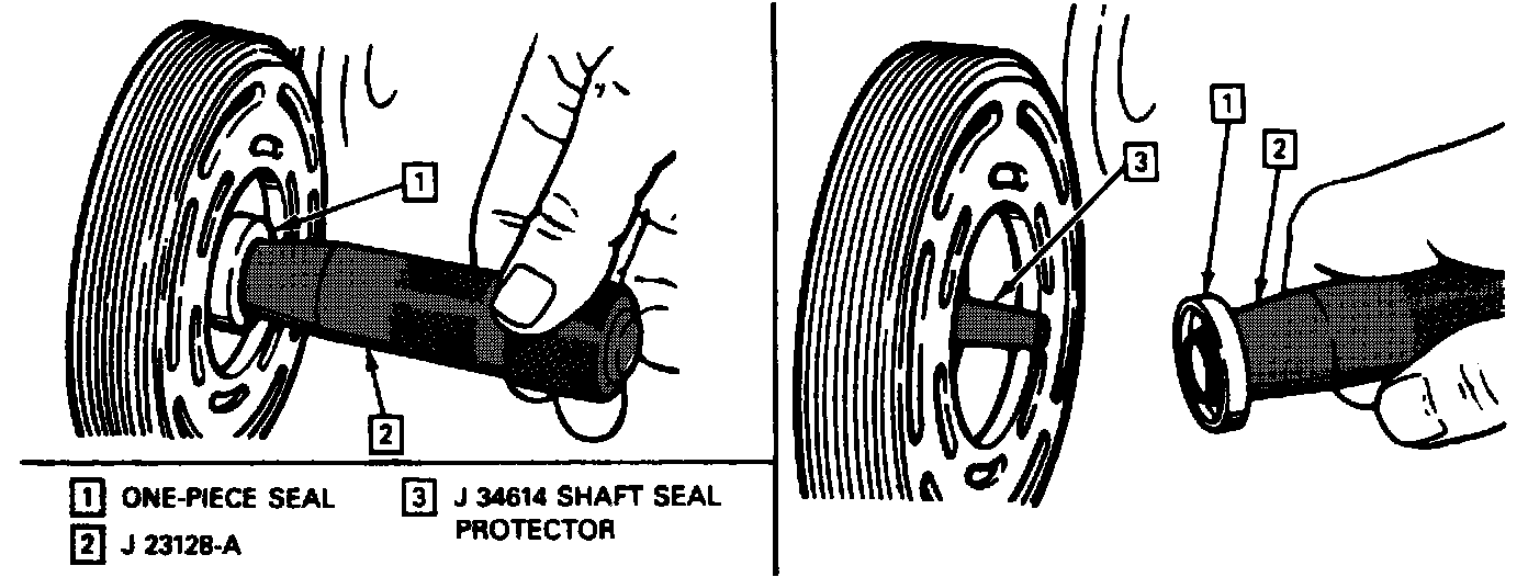 3. Dip the new seal in clean 525 viscosity refrigerant oil and assemble seal to Seal Installer J 23128-A, by turning handle clockwise. The stamped steel case side of the lip seal must he engaged with knurled tangs of installer so that flared-out side of lip seal is facing and installed towards the compressor. Install seal protector J 34614, in the seal lip and place over the compressor shaft, and push the seal in place with a rotary motion or place the seal protector J 34014 over end of compressor shaft, and slide the new seal onto the shaft with a rotary motion until it stops. Take care not to dislodge the O-ring. Be sure the seal makes good contact with the O-ring. Disengage the installer from the seal and remove the installer J 23128-A and the seal protector J 34614.