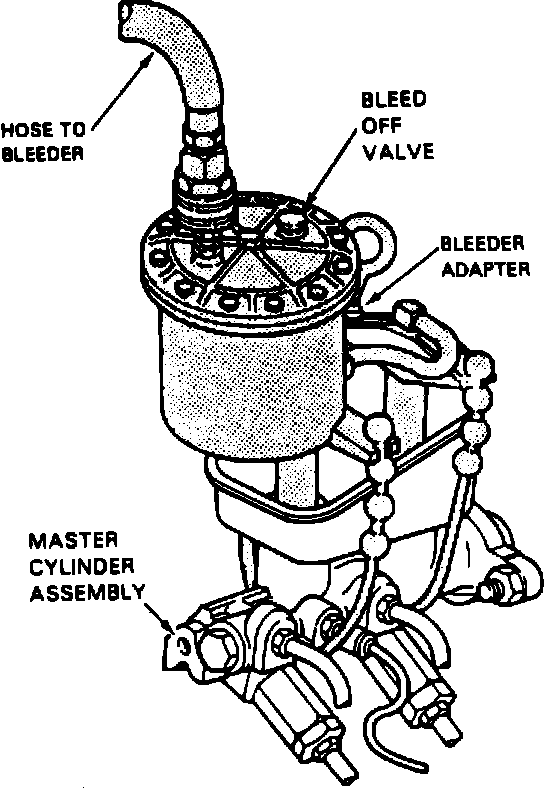 5. Open line valve on pressure bleeder, then depress bleed-off valve on adapter until a small amount of brake fluid is released.