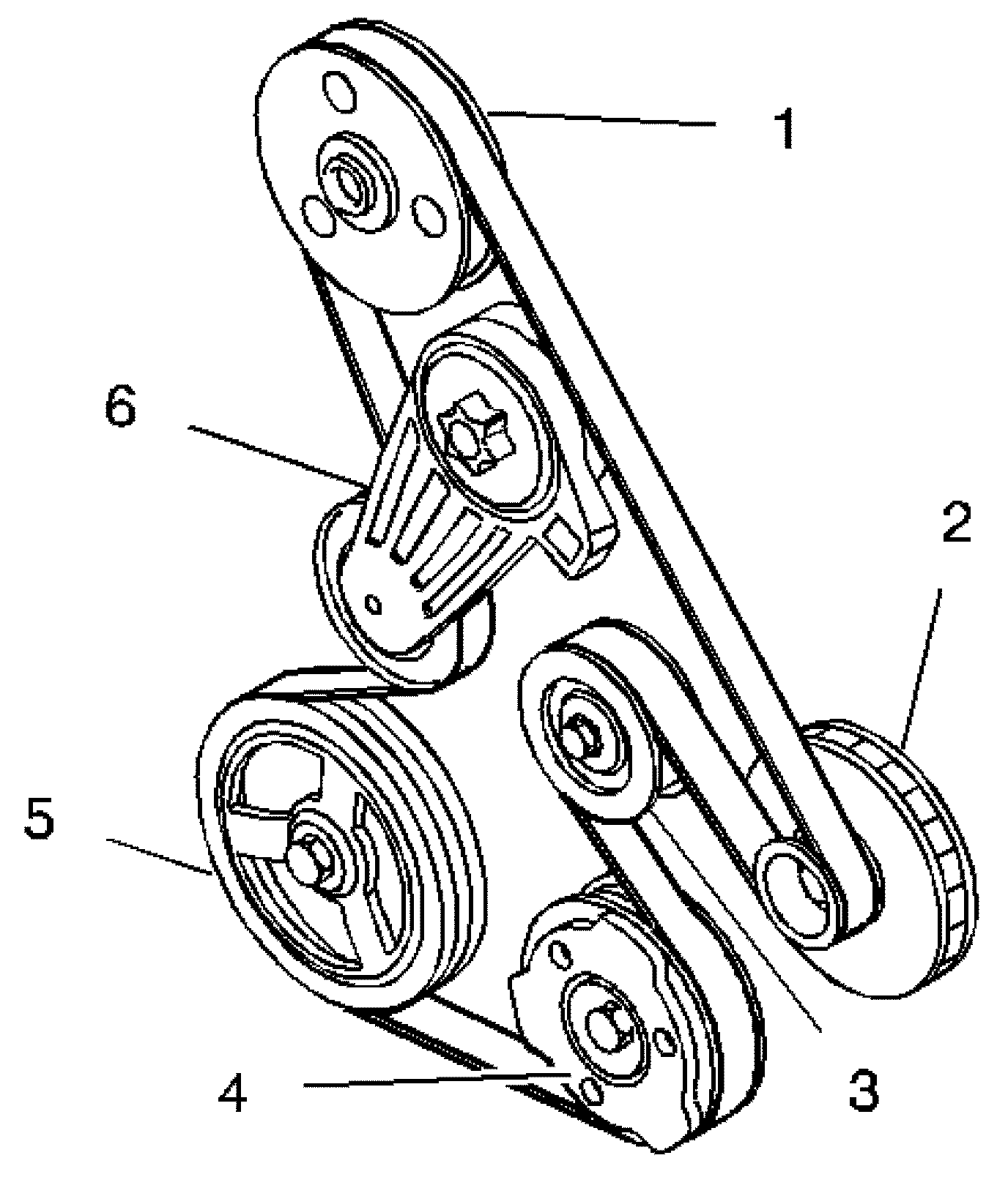 1. Thread the drive belt through all the pulleys except for the power steering pump (1) and the drive belt tensioner (6).