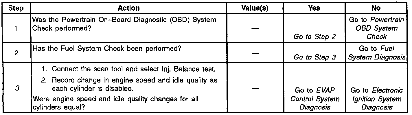The Fuel Injector Balance Test compares the performance of each of the cylinder by using the PCM to shut off fuel injection. This measures the performance of each cylinder by the amount of RPM drop caused by that cylinder not producing a power stroke. If proper fuel delivery has been determined, then a cylinder that does not show good performance (RPM drop) indicates either an ignition or mechanical problem.