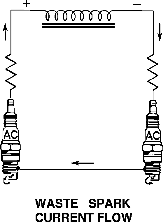 Since the polarity of the ignition coil primary and secondary windings does not change, one spark plug always fires with a forward current (center electrode to ground electrode) and its "companion" plug fires with a reverse current (ground electrode to center electrode). This is different from a convention distributor ignition system that fires all the plugs with the same forward current flow.