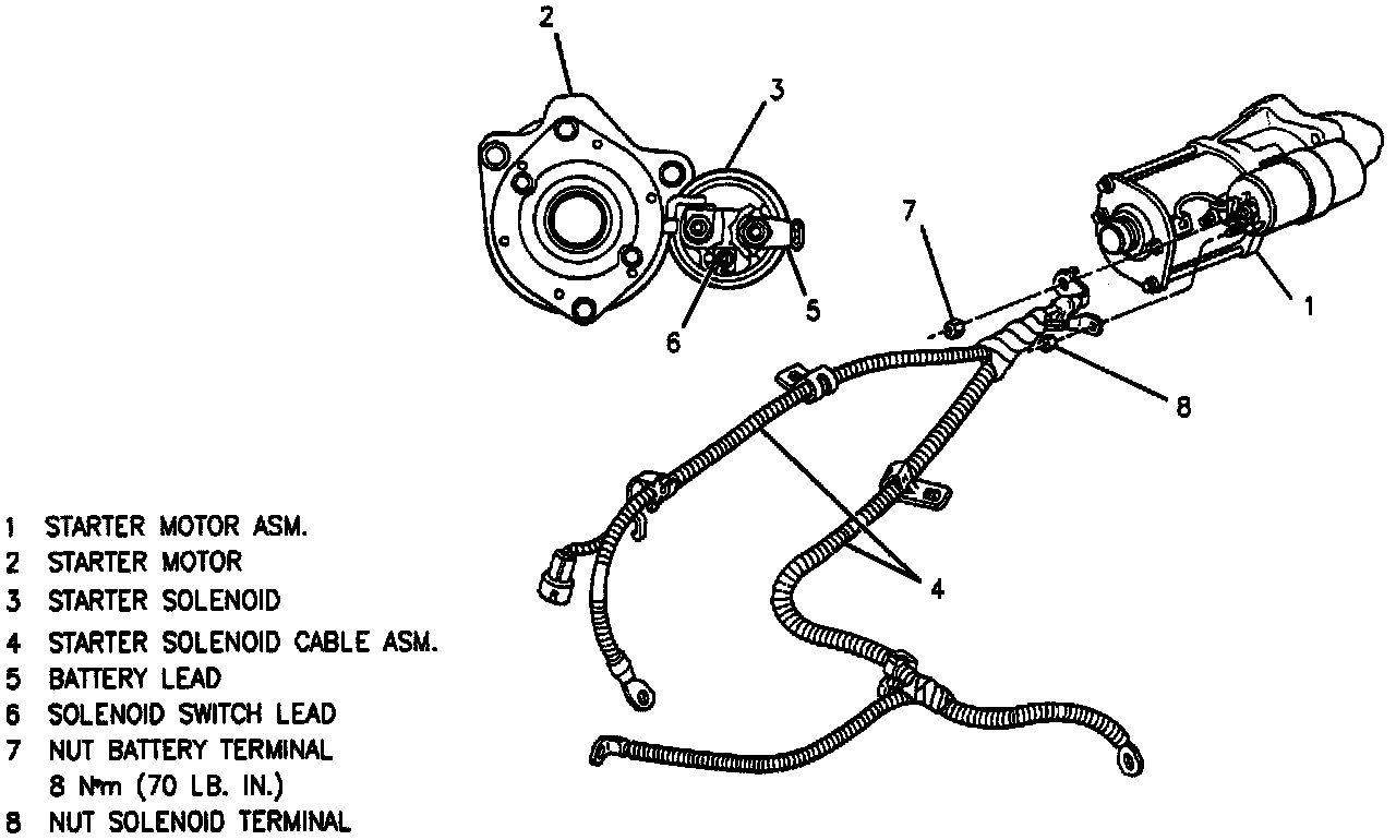 Note: Before installing starter motor to engine, tighten inner nuts on solenoid terminals to be sure they are secure in the cap. Tighten inner nuts on battery terminals and motor terminals to 8 Nm (71 Lbs.in.). If nuts are not properly tightened, starter may fail later due to terminal or cap damage.