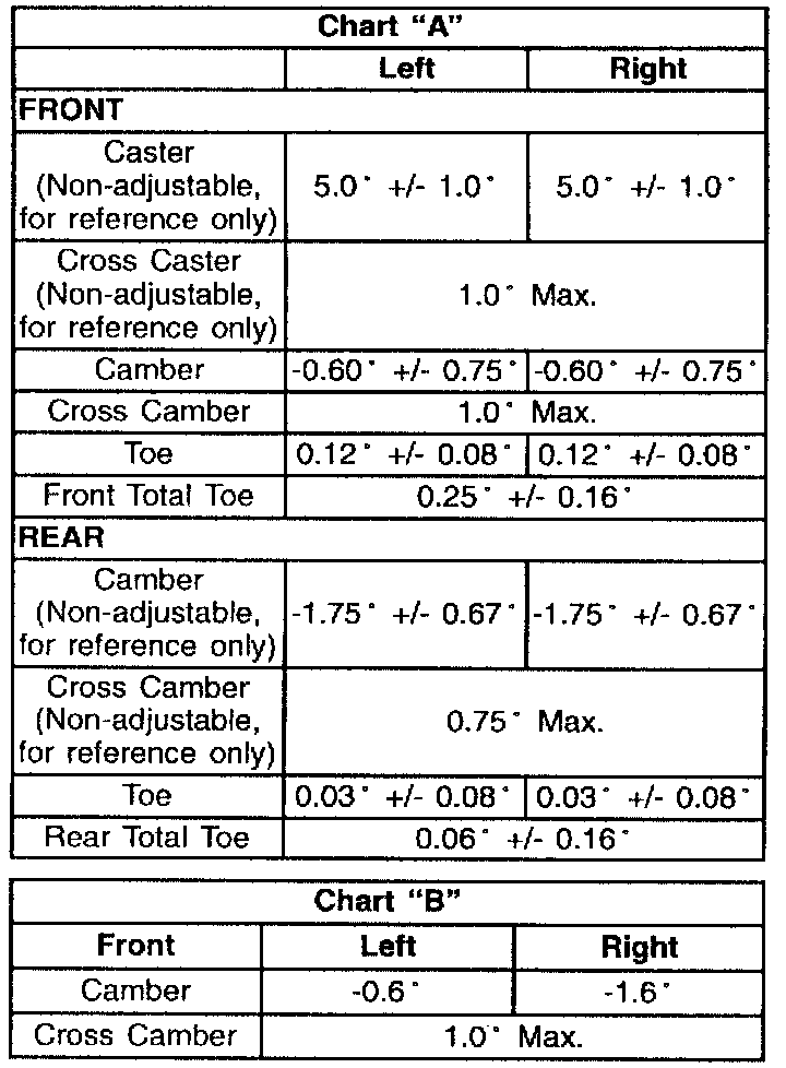 If the customer comments that the vehicle drifts to the right and no excessive tire wear is apparent, set the alignment to the specifications shown in chart "A", with the front camber biased as shown in chart "B".