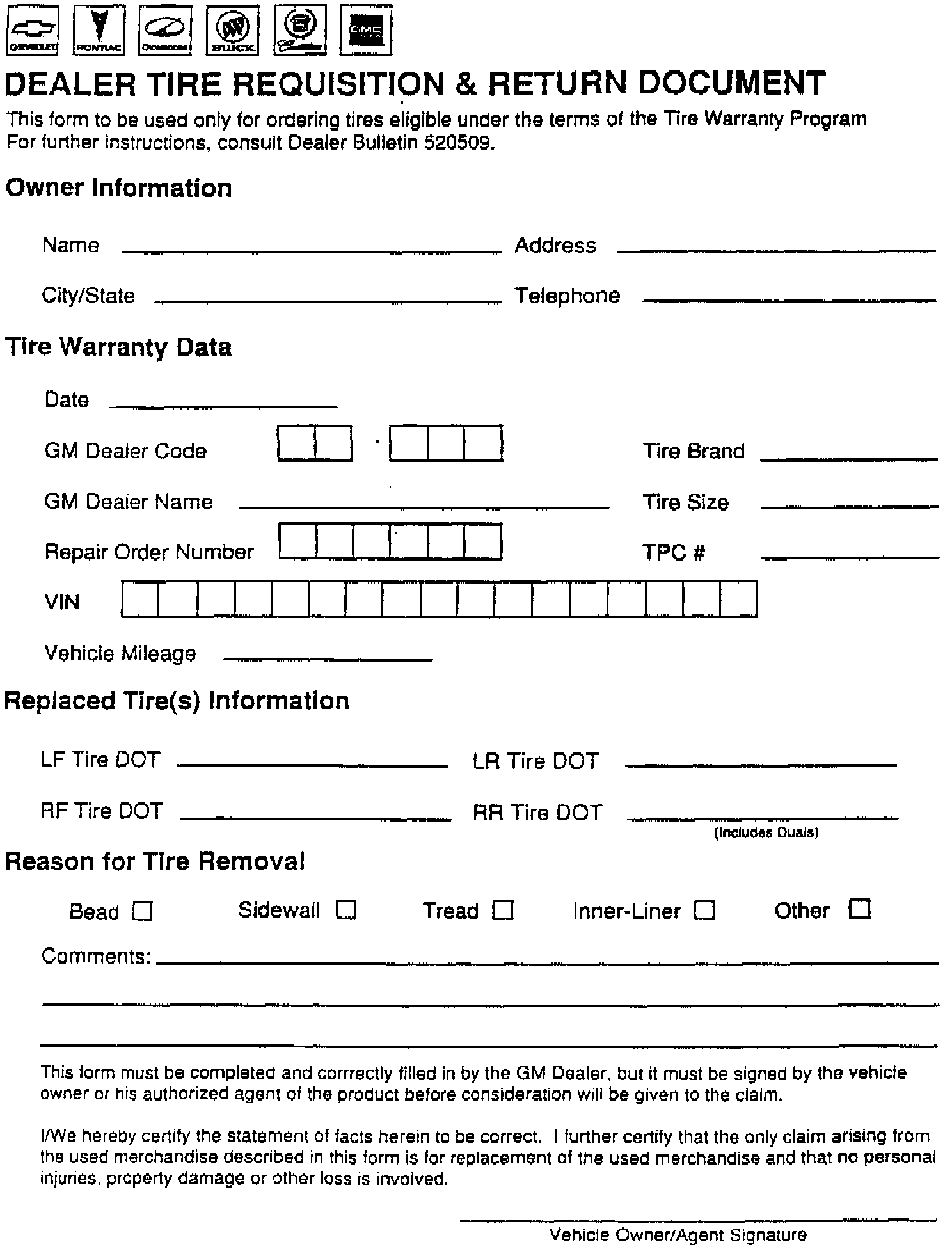 If a problem is encountered in obtaining tires, call the Goodyear Tire Assistance Number (1-888-637-3784) for assistance. In all instances, a GM Tire Requisition and return Document must be completed and given to the local Goodyear Tire dealer to obtain tires. This document is attached. Additional copies of this form should be made locally at your dealership as needed. Old tires should be returned to Goodyear.