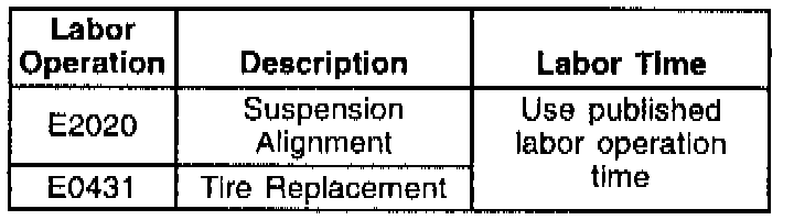A new tire (introduced into production at VIN breakpoint WR183651) is available through Goodyear. This new tire has the tread pattern reversed to eliminate a drift/lead right condition. Use only the alignment specifications in chart "A" with these new tires. Do not use the biased camber specifications from chart "B" with these new tires.
