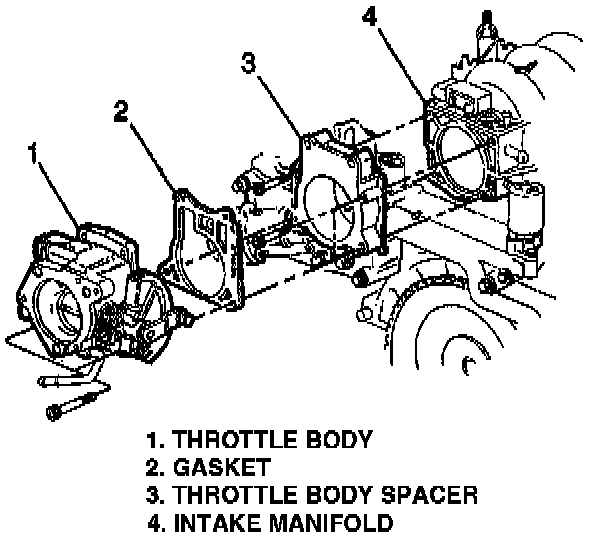 2. Install the throttle body (1) to throttle body spacer (3) and finger tighten 2 lower bolts.