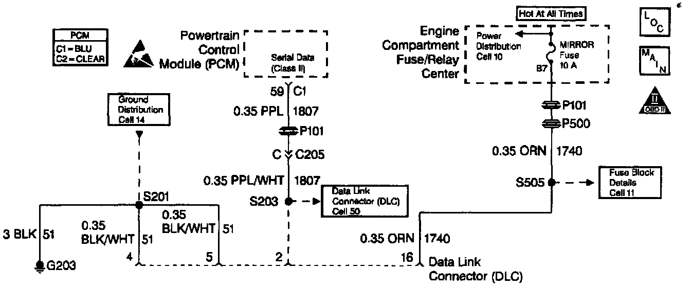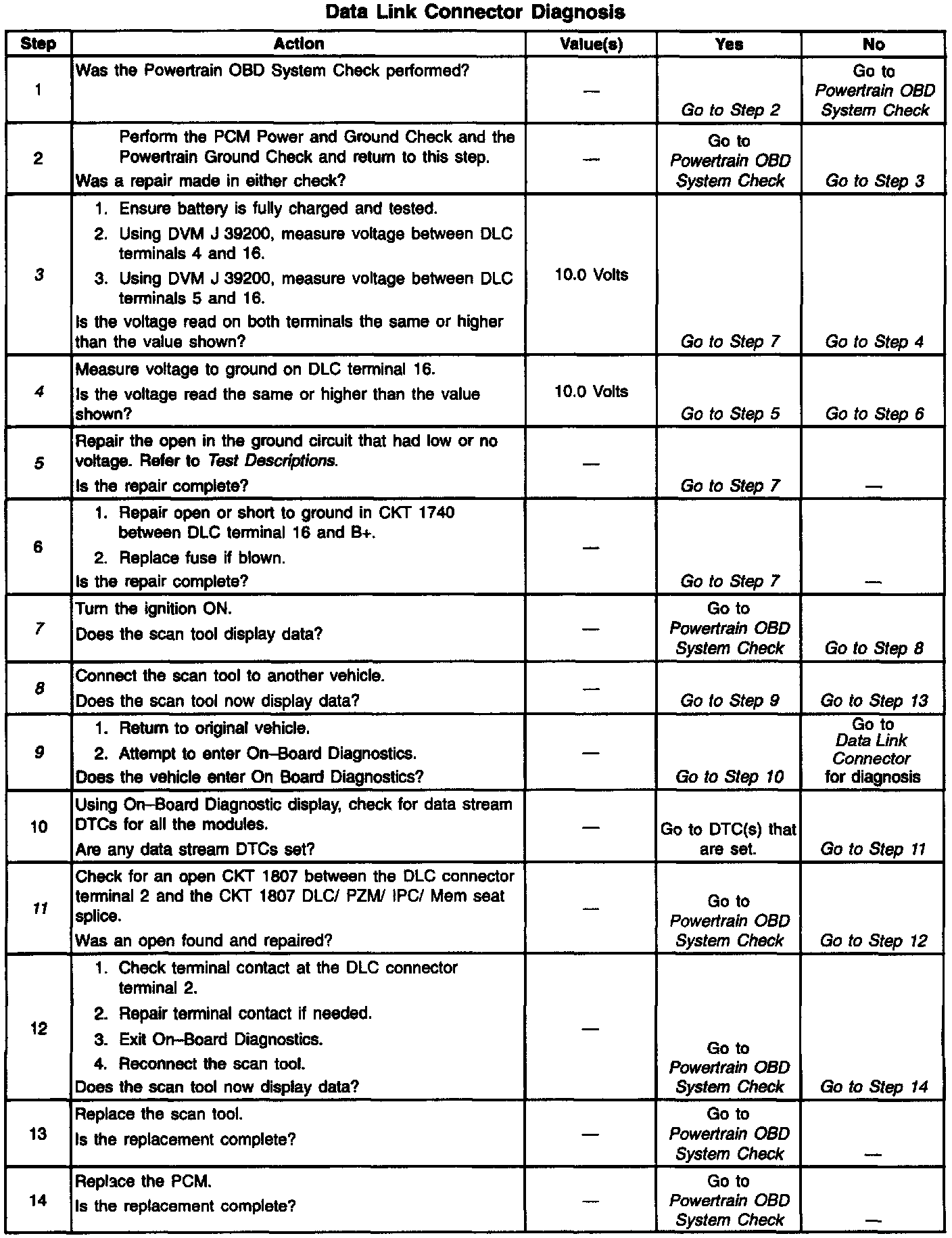 The Data Link Connector (DLC) check is used to identify the cause of an inoperative scan tool. Possible faults include scan tool non-power up and lack of communication between the scan tool and the PCM. The DLC supplies power to the scan tool through CKT 1740 to terminal 16. The ground to the scan tool is supplied through CKT 51 to terminal 5. The serial data (communication) is supplied to the scan tool through CKT 1807 to terminal 2.