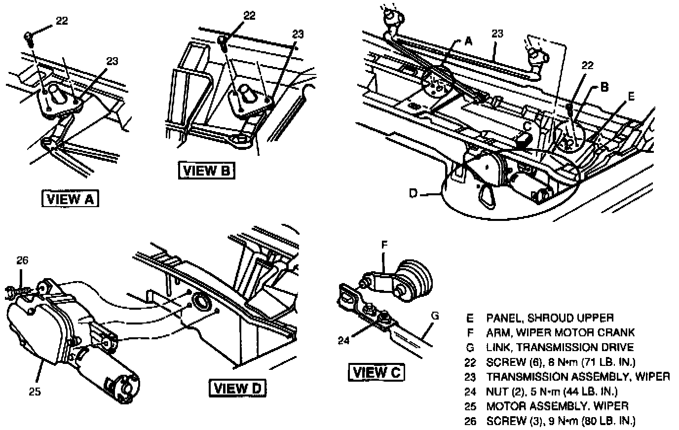 2. Position wiper transmission assembly (23) in plenum chamber through shroud upper panel openings.