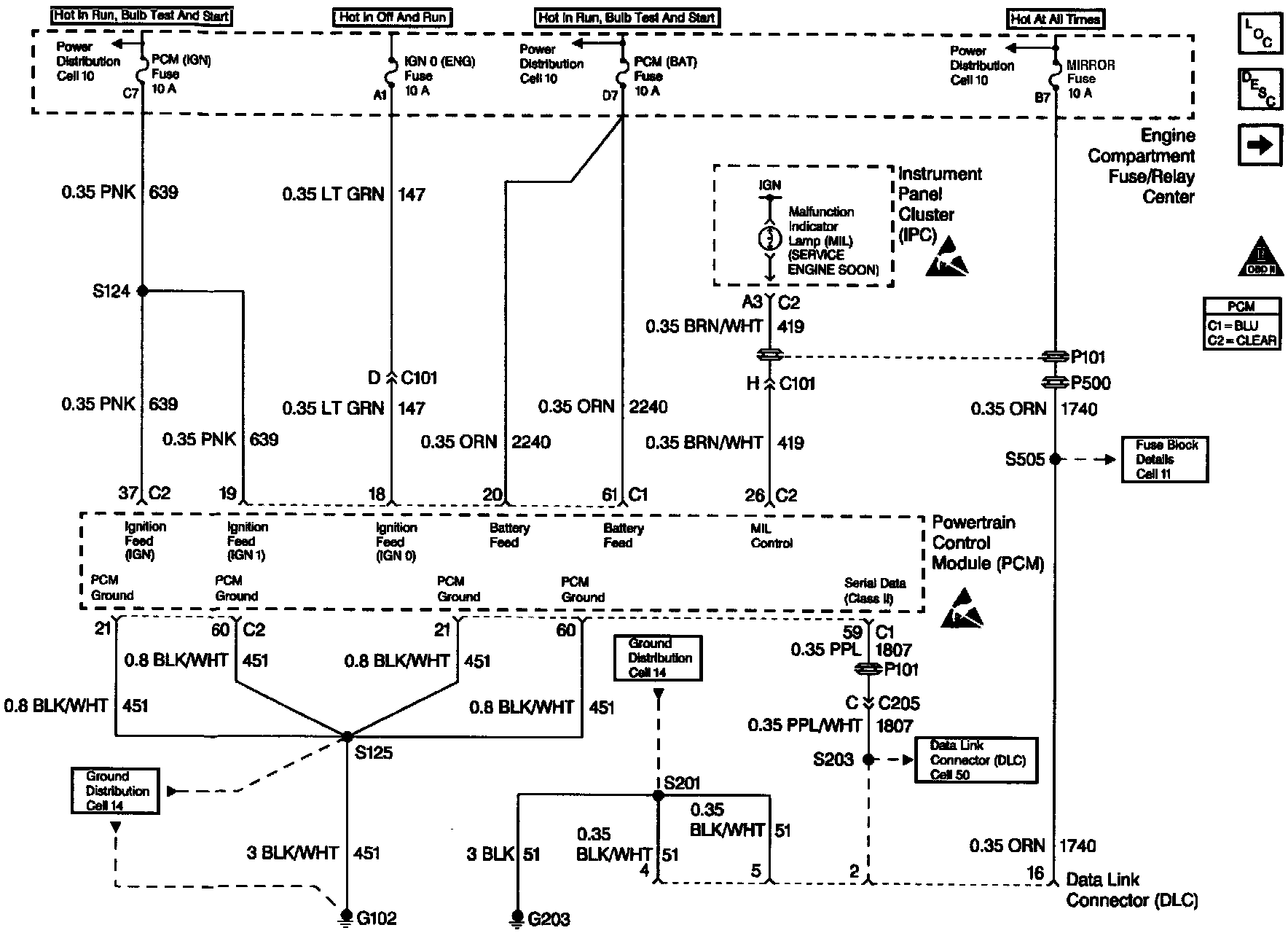 There are several vehicle grounds that are essential for proper powertrain system operation. Loose or poor ground connections may cause widely varying problems, from flickering telltales to PCM DTCs to driveability problems. The PCM Power and Ground Check (2 of 2) should be performed when referred to by other diagnostics or when erratic or intermittent problems defy traditional diagnosis. The PCM Power and Ground Check (2 of 2) chart lists these grounds and other pertinent information that will allow you to investigate a possible loose or faulty ground connection.