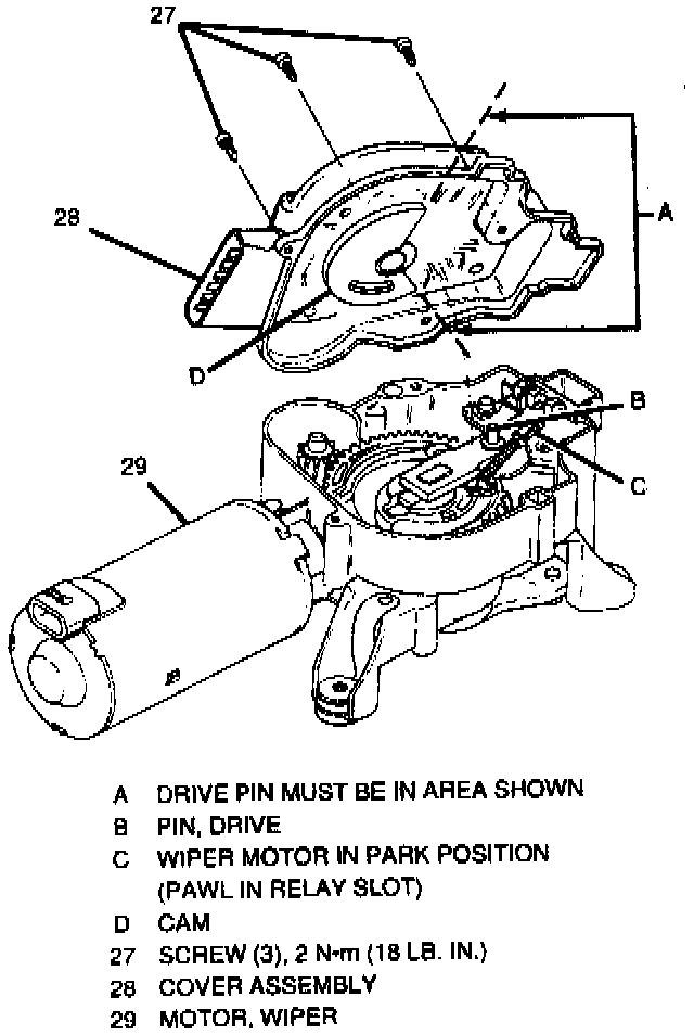 2. Operate wiper motor (29) back into park position (pawl in relay slot).