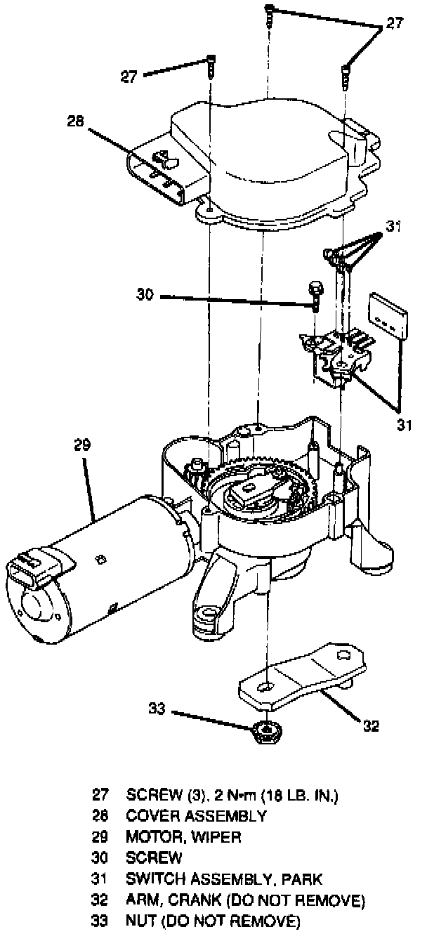 3. Wiper motor cover assembly (28). Follow "Wiper Motor Cover Assembly Replacement" procedure carefully.