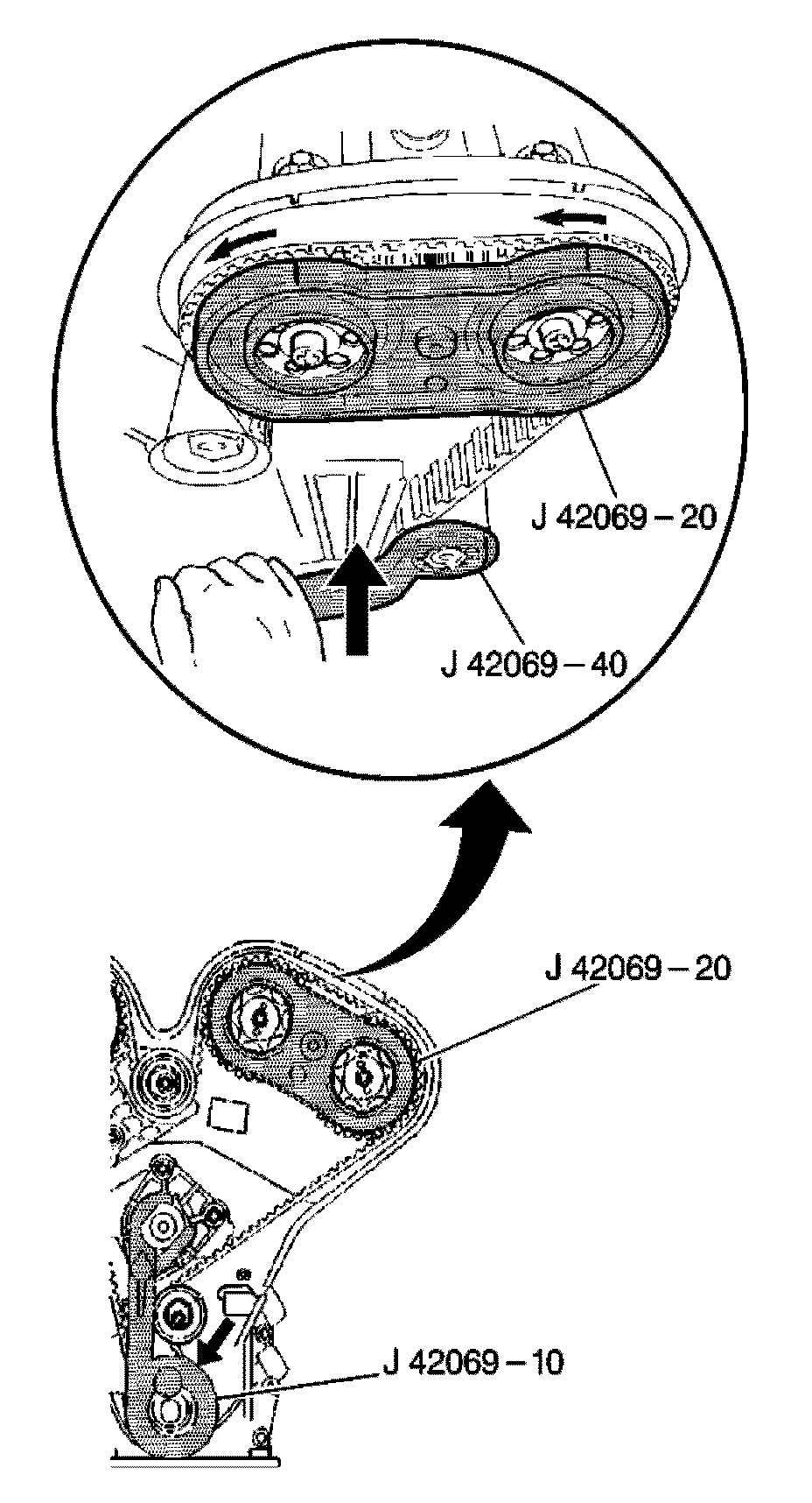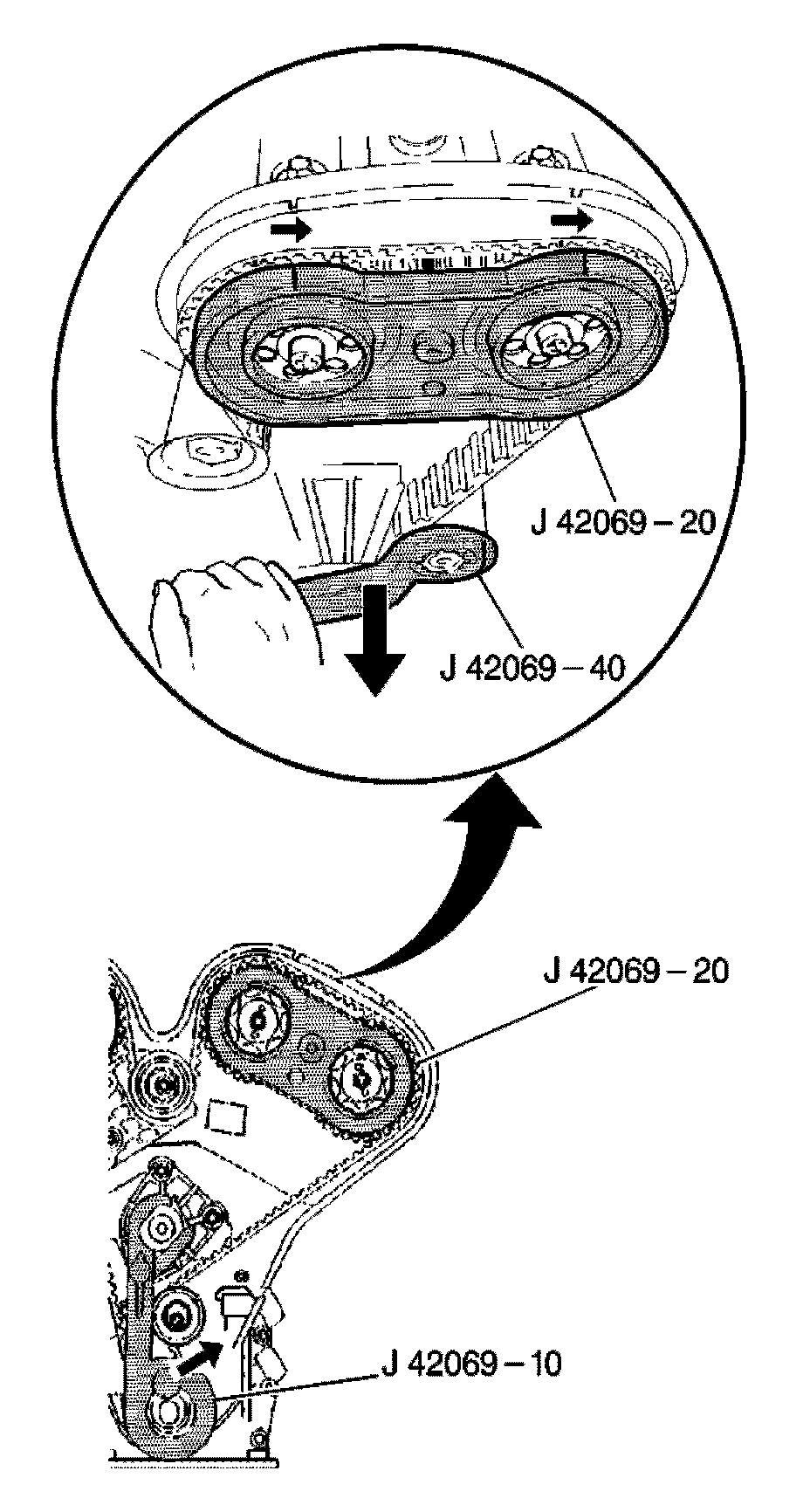 1. With the J 42069-10 in place locking the crankshaft at TDC: