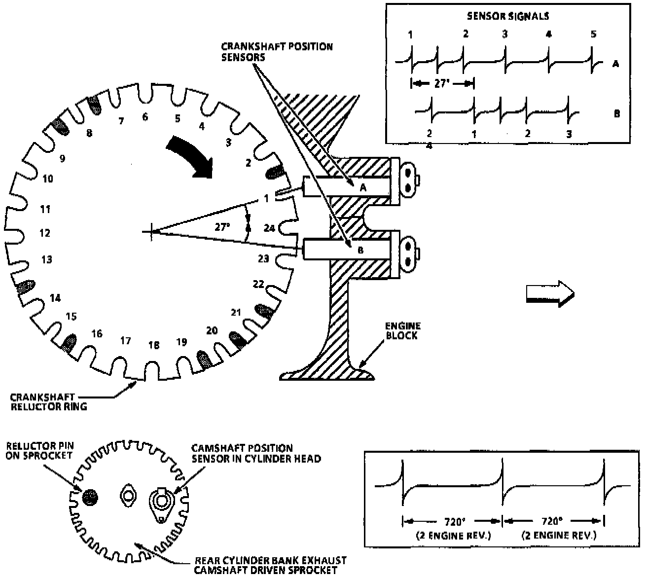 ^ Because of the physical location of the two crankshaft position sensors, the signal of "B" lags the signal of "A" by 27 degrees of crankshaft revolution.