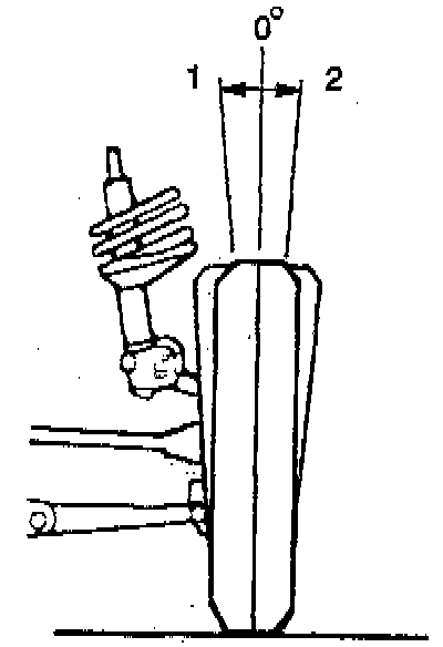 The camber is the amount the wheels tilt from vertical when viewed from the front or rear of the car. The camber is positive (+) if the wheels tilt outward at the top (2). The camber is negative (-) if the wheels tilt inward at the top (1). The amount of tilt is measured in degrees from the vertical. Excessive positive camber may cause outside shoulder wear on the tires. Excessive negative camber may cause inside shoulder wear. Excessive camber will also cause the vehicle to pull or lead to the side having the most positive camber.