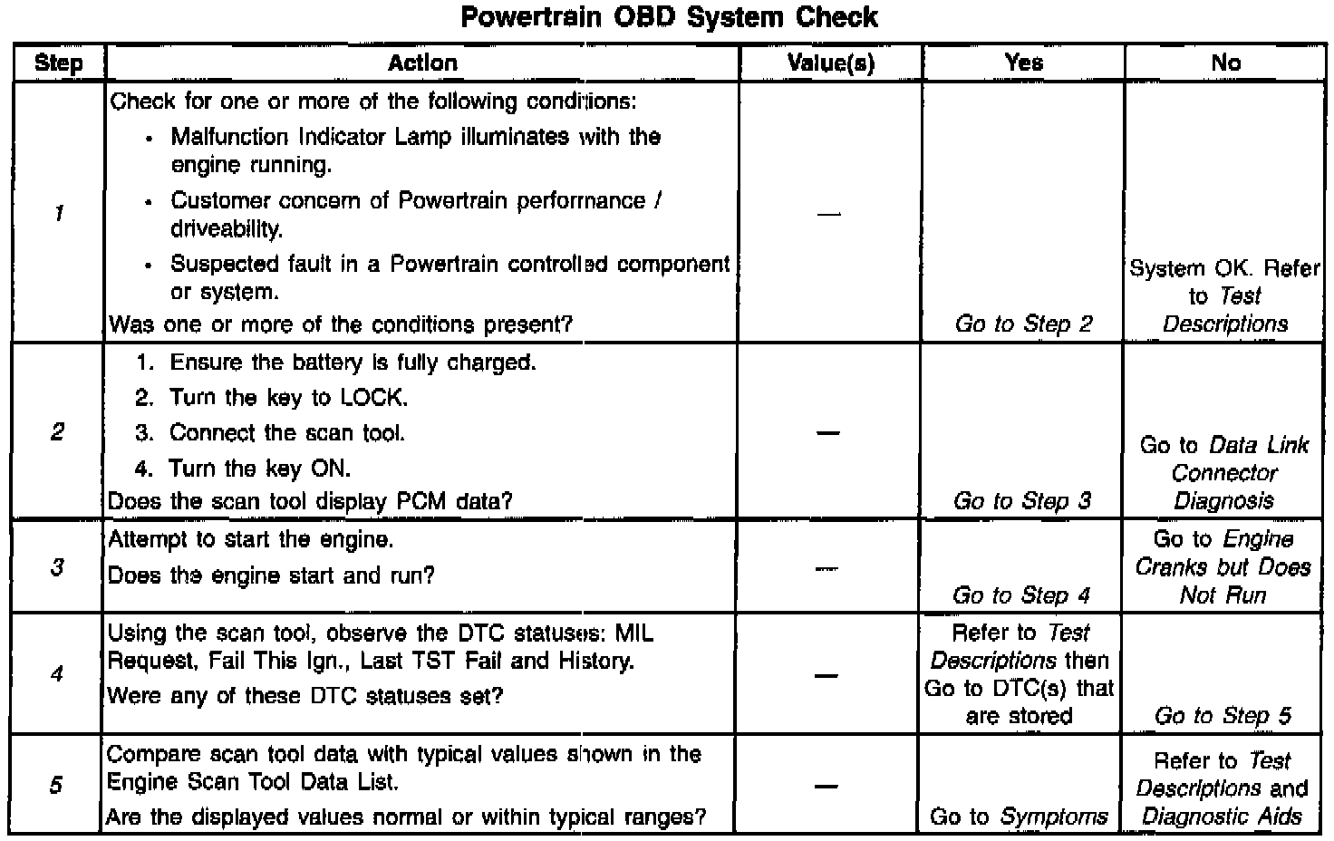 The Powertrain OBD System check is an organized approach to identifying a problem created by an electronic engine control system malfunction. The Powertrain OBD system check must be the starting point for any driveability complaint diagnosis, because it directs the service technician to the next logical step in diagnosing the complaint. Understanding the table and using it correctly will reduce diagnostic time and prevent the replacement of good parts.