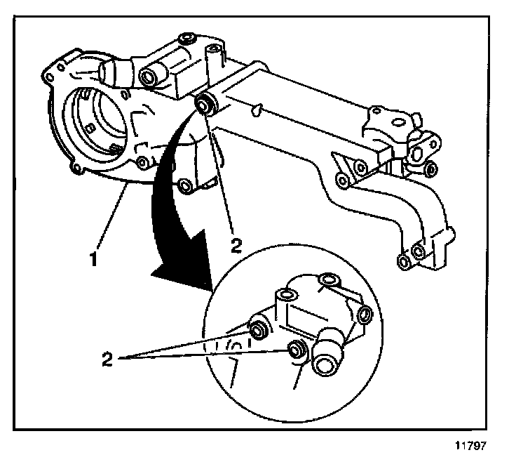 4.2. Remove 2 plugs (2) and clean passages with a wire brush. Remove all loose particles.