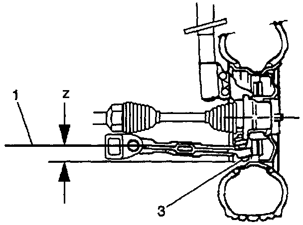 Measure the clearance (Z) between the centerline of the bushing bolt (1) and the lowest point on the ball joint (3) (excluding the grease fitting).