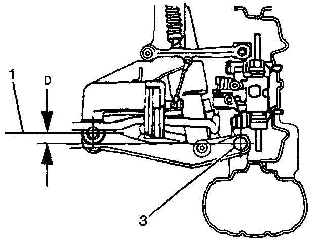 Measure the clearances (D) between the centerline of the front inner bearing bushing bolt (3) and the centerline of the front outer bushing bolt (1) (this measurement should be taken on the front side of the rear suspension assembly).