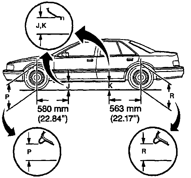 Measure the clearances (J,K,P,R) between the underbody and the ground.