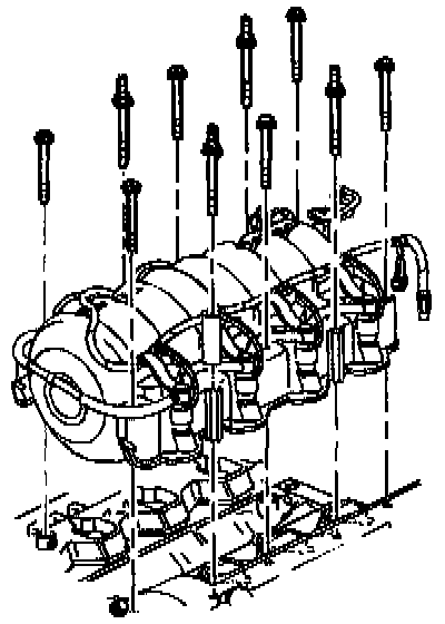 17. Remove six bolts, four studs and the intake manifold.