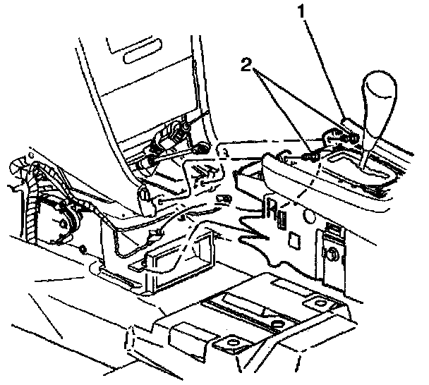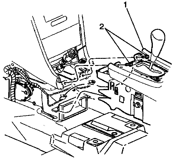 14. Remove two nuts (2) from console rear to floor pan.