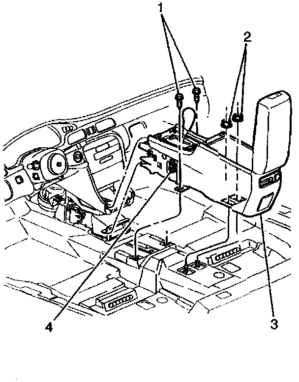 6. Install the two nuts (2) to the floor studs in the console bucket.