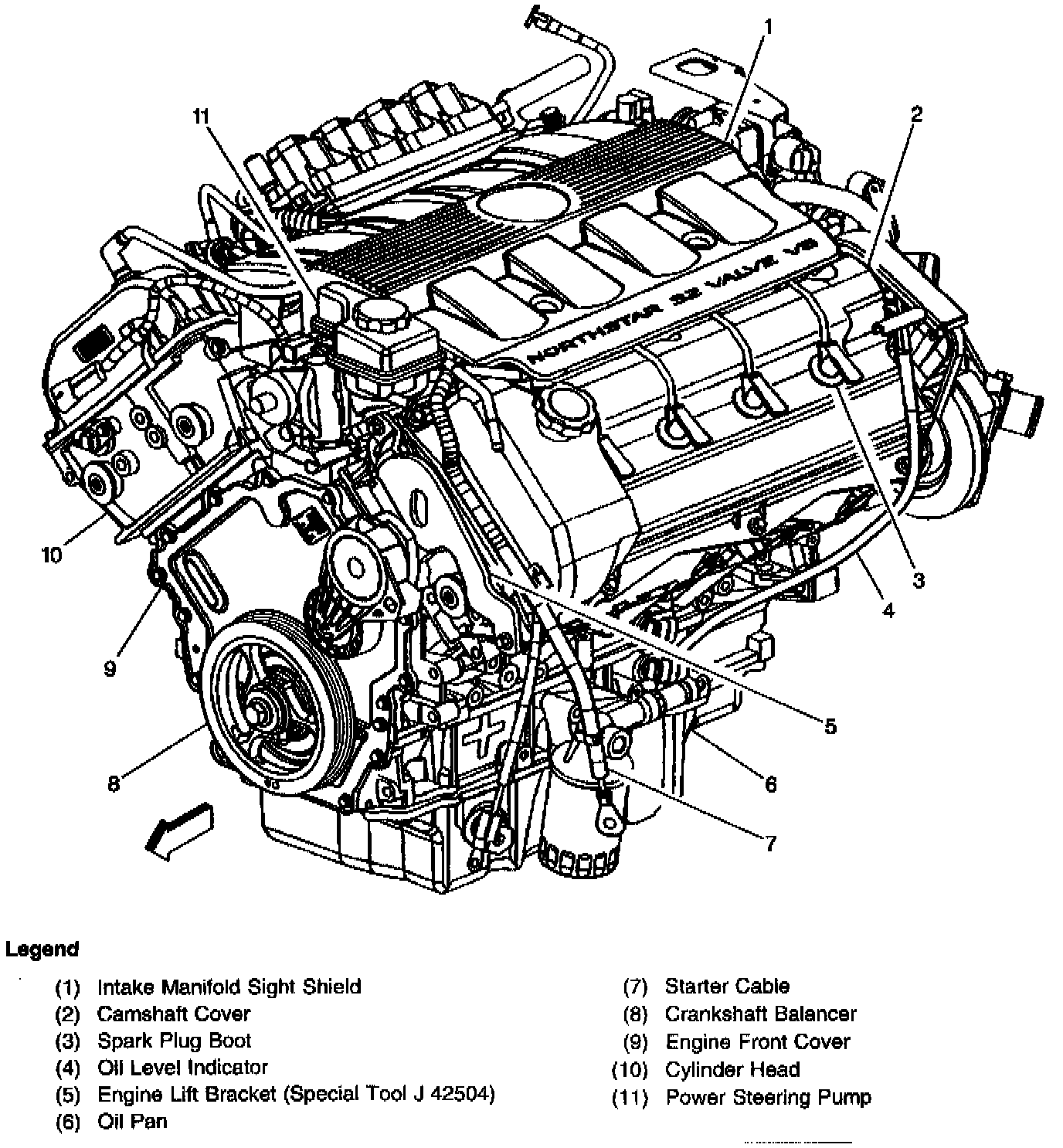 The Northstar V8 VIN Code 9 or Y is a 4.6L (279 cu in.) engine incorporating two intake and two exhaust valves per cylinder with individual cylinder head mounted camshafts for intake and exhaust functions (DOHC). The cylinder bore diameter is 93 mm (3.66 in.) and the piston stroke is 84 mm (3.31 in.). The cylinders are arranged in two banks of four with a 90 degree included angle. The left (front) bank of cylinders are number 2-4-6-8 and the right (rear) bank cylinders are 1-3-5-7.Engine firing order is 1-2-7-3-4-5-6-8.