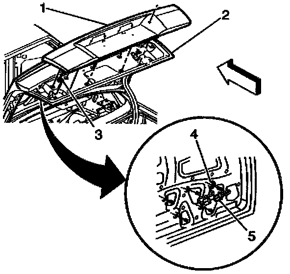 5. Connect the backup lamp connector (5) to the rear compartment lid wiring harness.